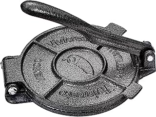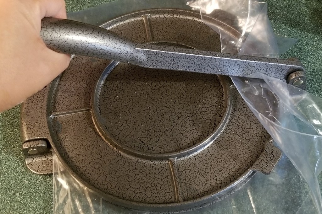 If making tortillas – Warm up a griddle, comal, or iron skillet over medium heat.  Divide the reserved corn dough (masa) into 12 portions, approximately 35 g each.  Working with one portion at a time, form into a ball, and place between plastic sheets, either on a flat surface, or a tortilla press (photo below, left).  Flatten by pressing down with a cutting board, or a mould with a flat bottom, or by closing the tortilla press (photo below, centre).   Remove flattened dough disc from the plastic sheets, peeling onto one hand (photo below, right):