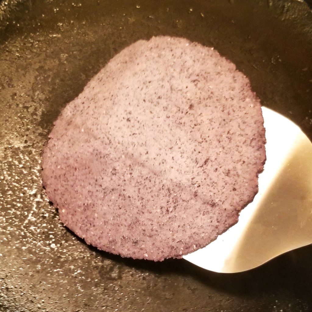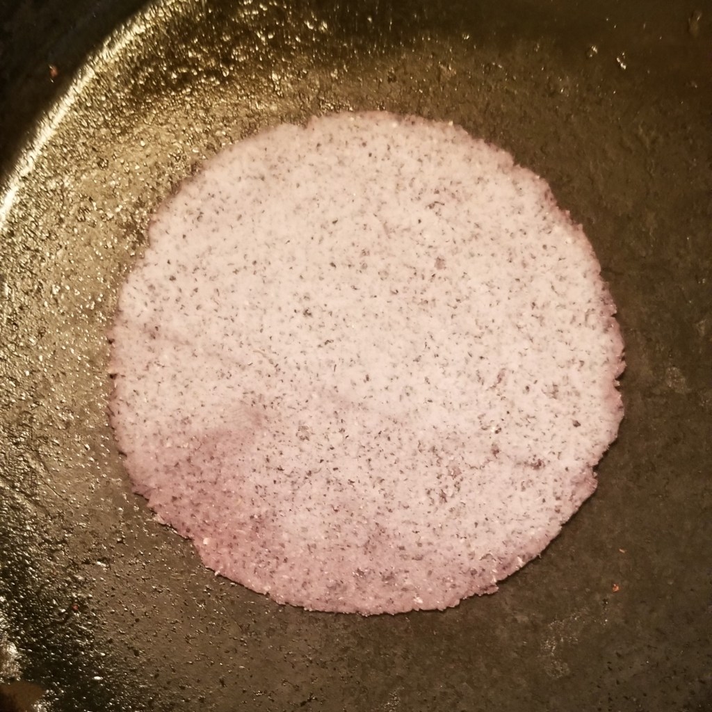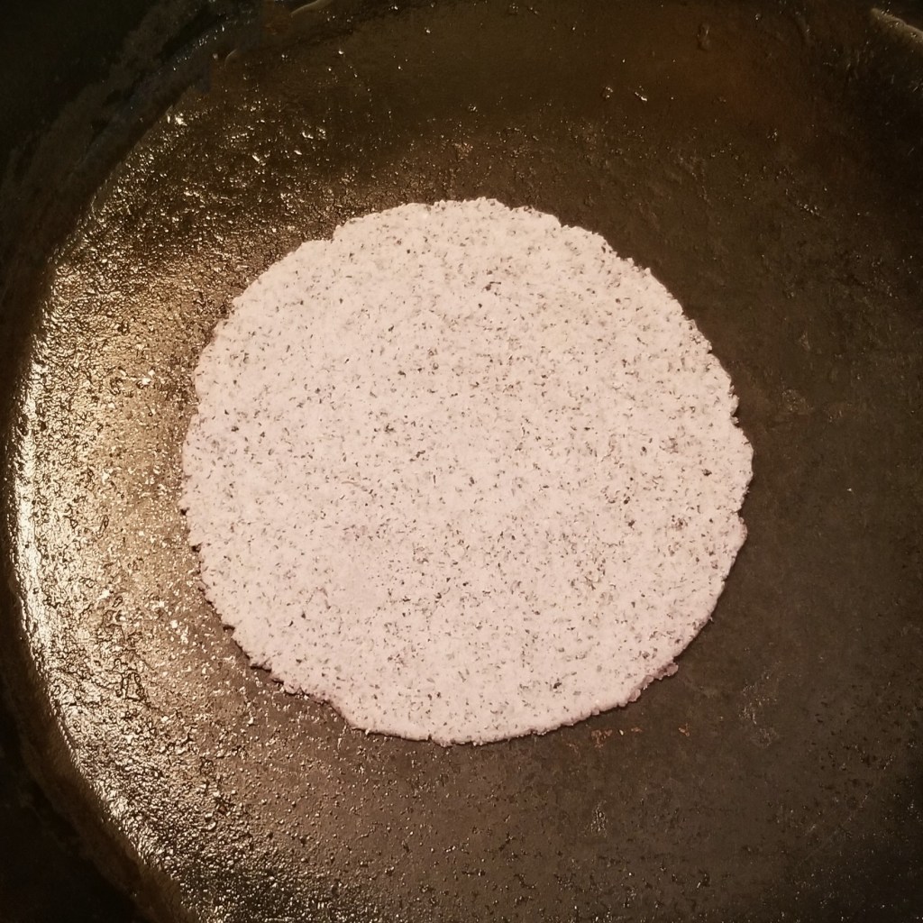 Place disc (about 5 in – 12.7 cm in diameter), on hot griddle or skillet (photo below, left).  wait a few seconds, until the edge starts to dry (photo below, right):