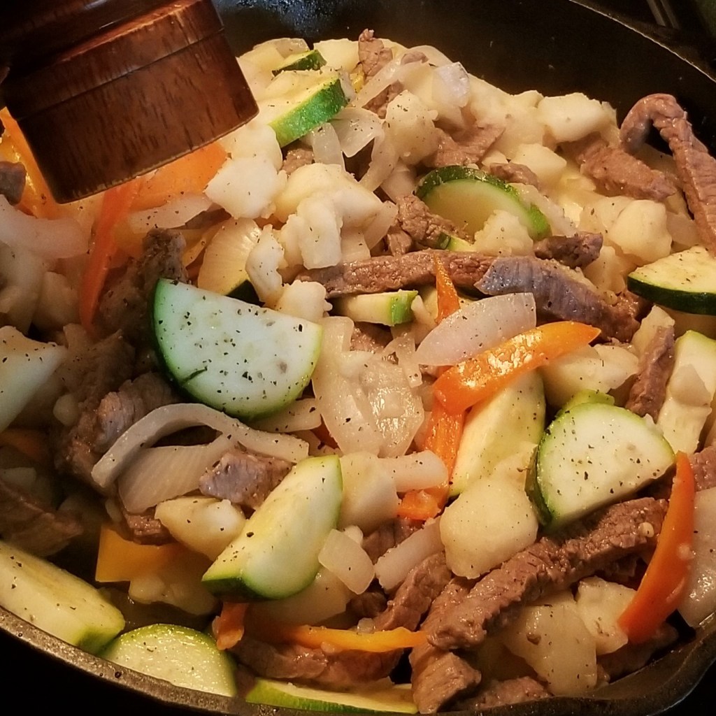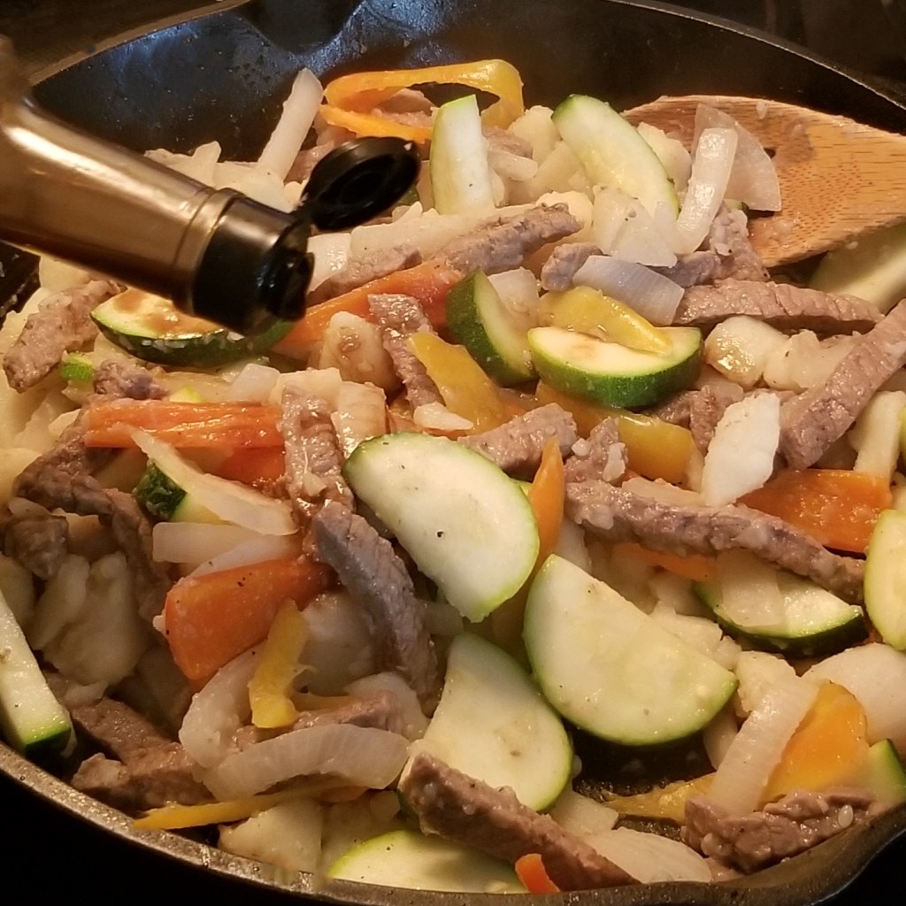 This is a quick stir-fry  dish, perfect to deal with a weekday dinner rush.  Some steak, pantry staples, and available veggies is all that is needed.  In my case, I had a couple of zucchini and some hot wax peppers; other veggies could be green beans, cabbage, bell peppers, etc.
