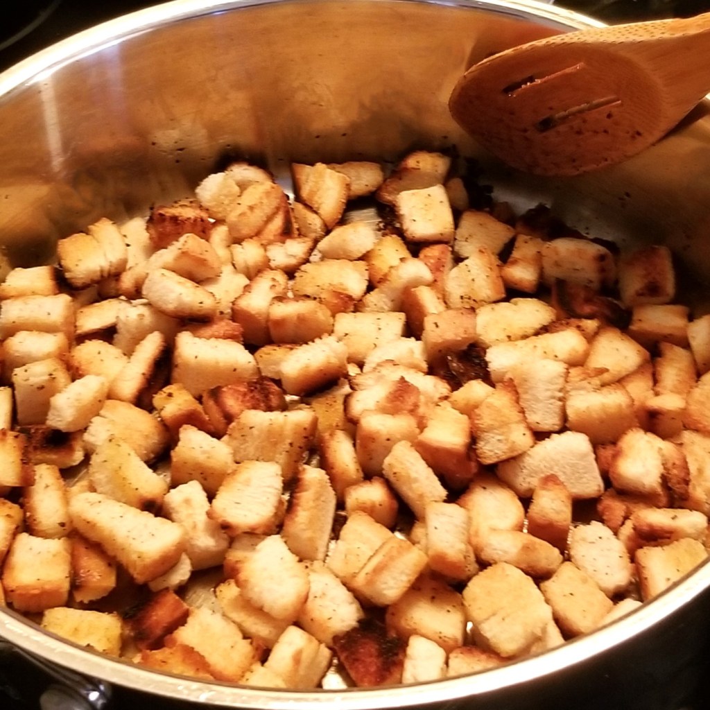 155g (1/3 lb) day-old bread; sliced, cut into cubes, and toasted, approx. 4 cups