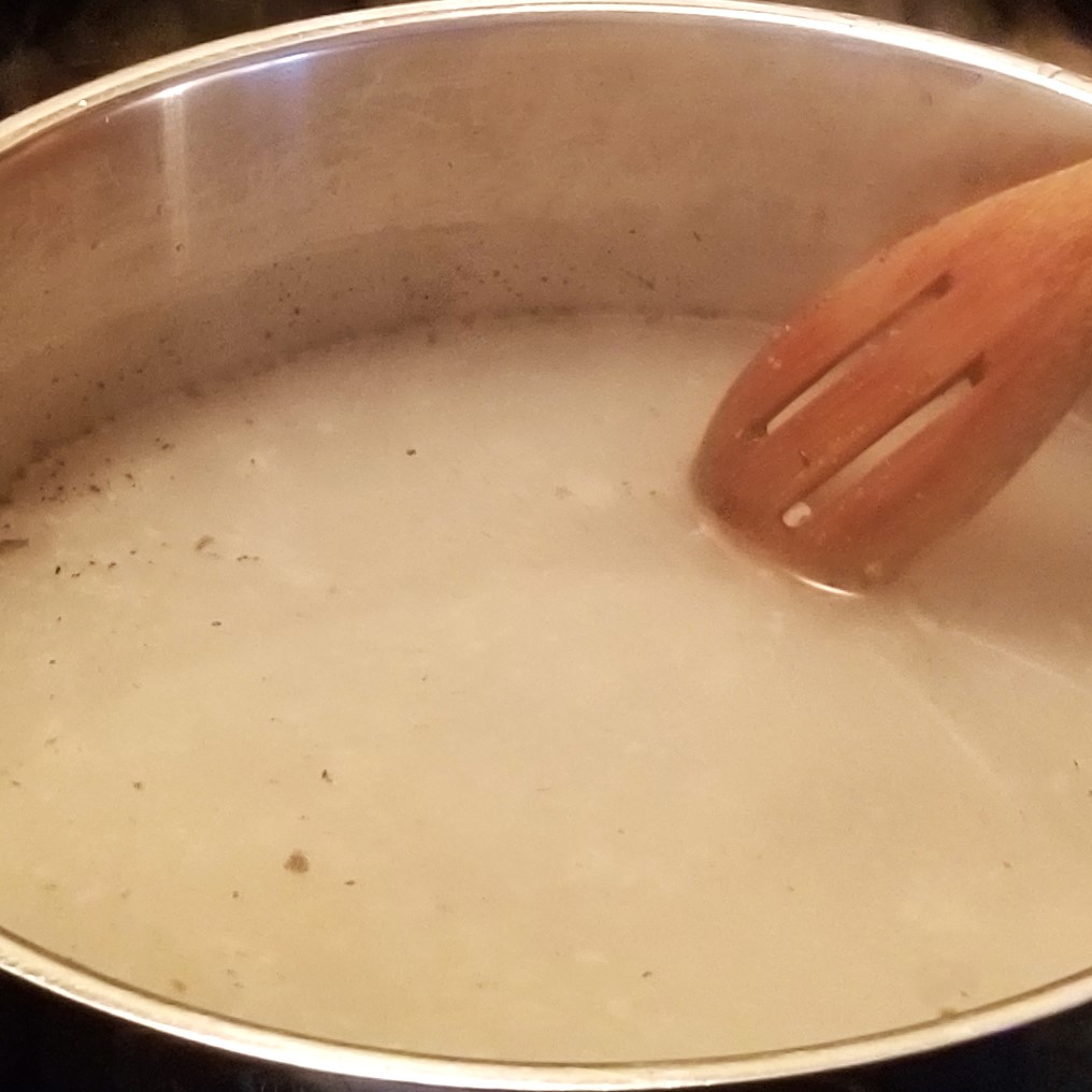Pour reserved blended garlic into the pan (photo below, left). Bring to a simmer, scrapping the bottom of the pan with a wooden spoon (photo below, right):