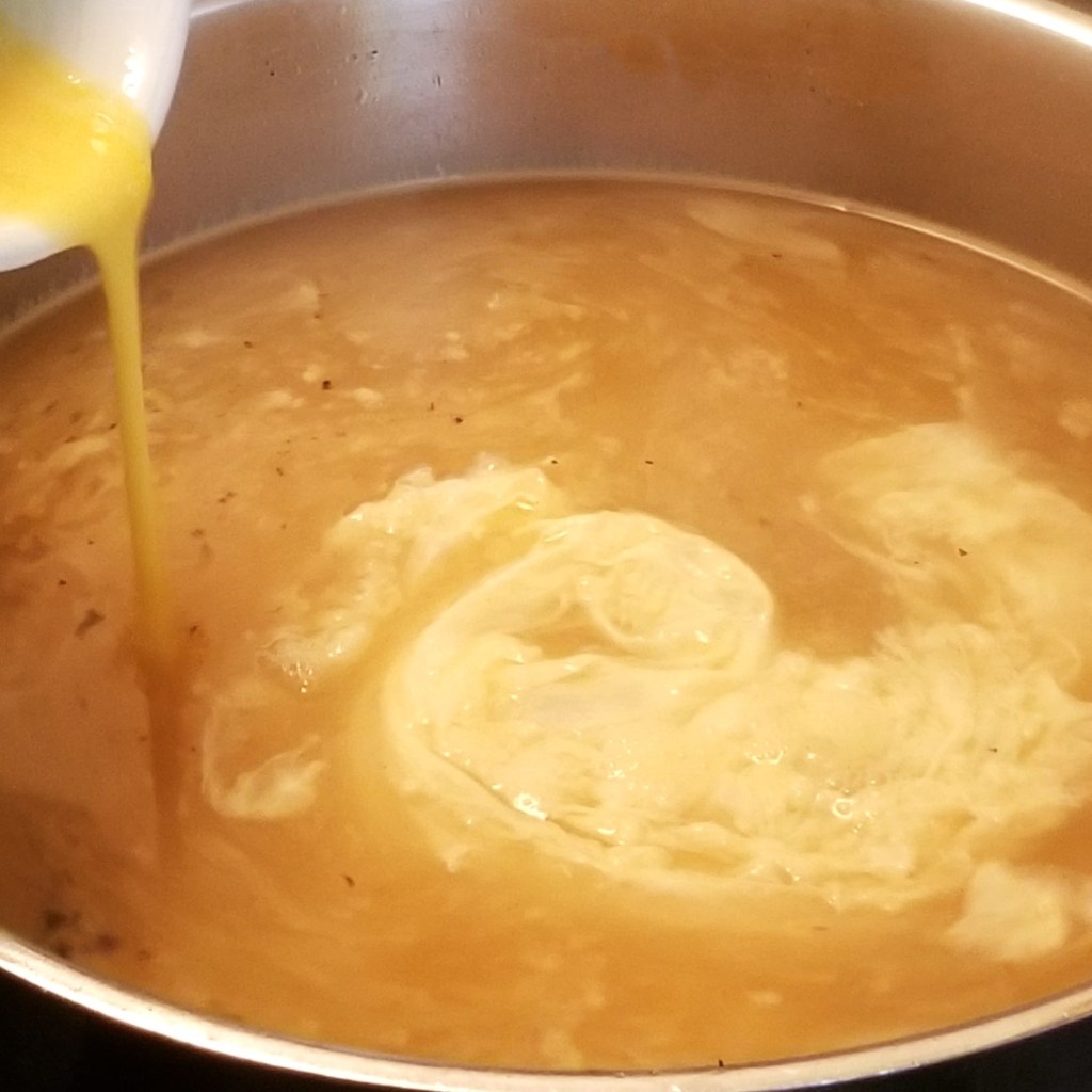 The egg should cook into strings; season with salt and pepper, to taste, and continue stirring so the egg with not clump. Turn off the heat, and serve soup immediately.