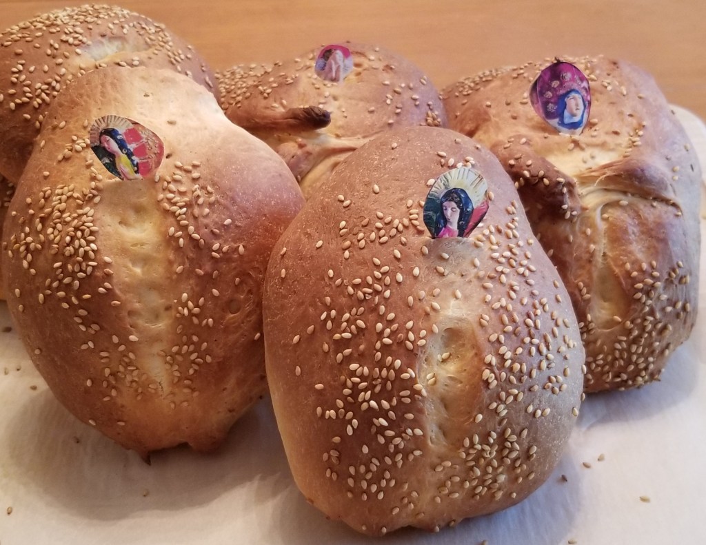 Pan de yema (Yolk Bread) is very traditional in the Mexican state of Oaxaca, baked all year round, but prepared in a very special way at the peak of the Day of the Dead celebrations, in human shapes, and often decorated with caritas (little faces) called alfeñiques, a form of folk art on their own, originated in Italy and brought to Mexico by the Spaniards. Many are made with sugar, but the ones for this bread are made with lard and flour. I could not make authentic alfeñiques, so I printed a photo from an article in México Desconocido, cut the faces out, and placed them on my bread after baking: