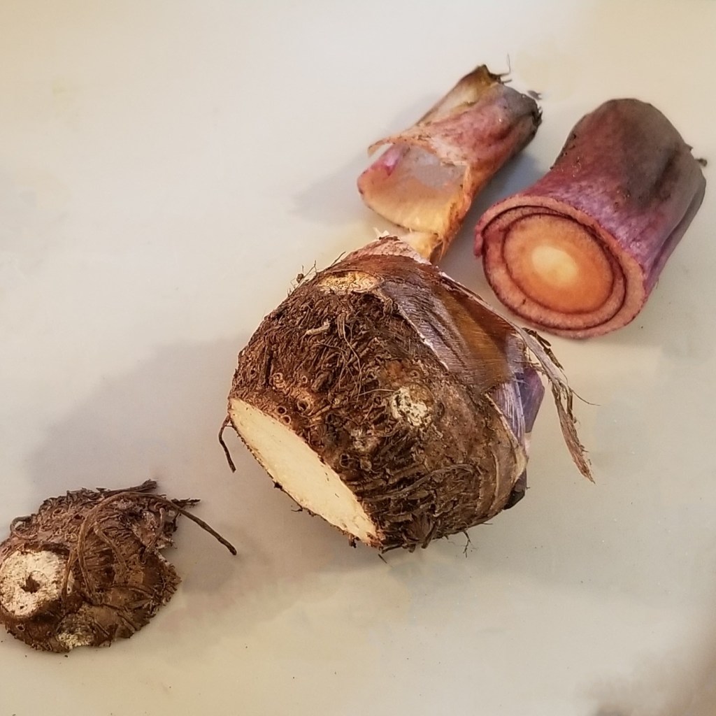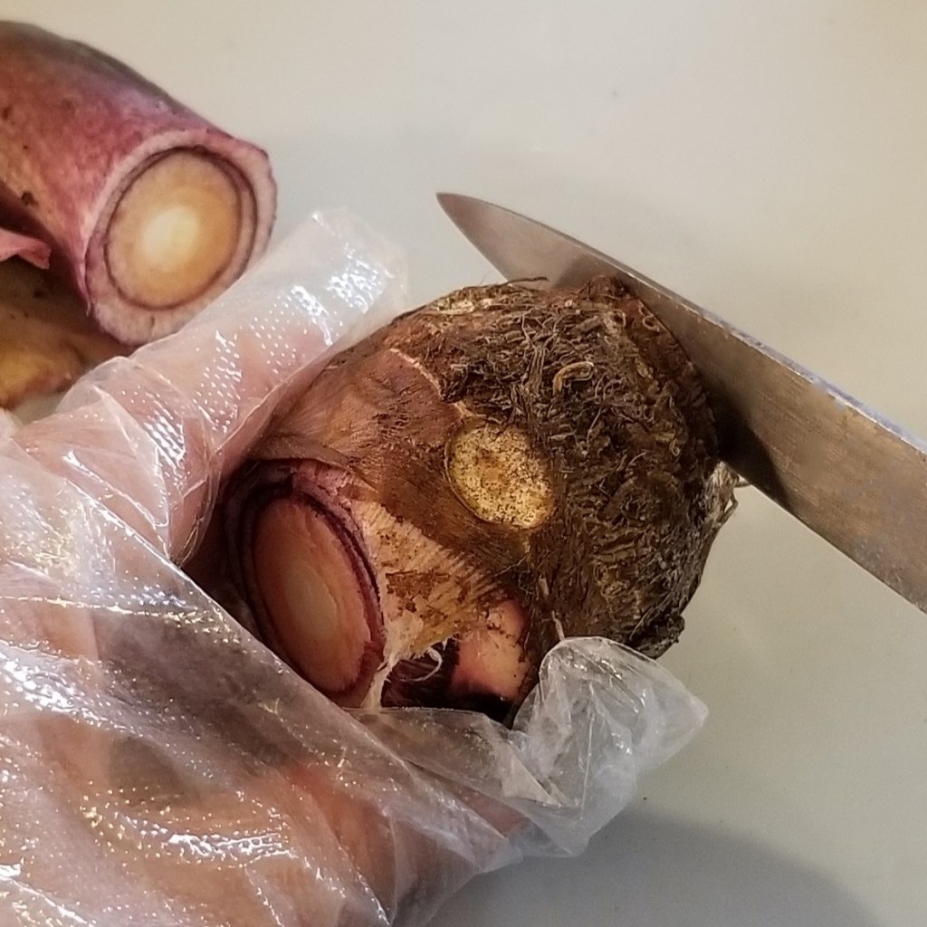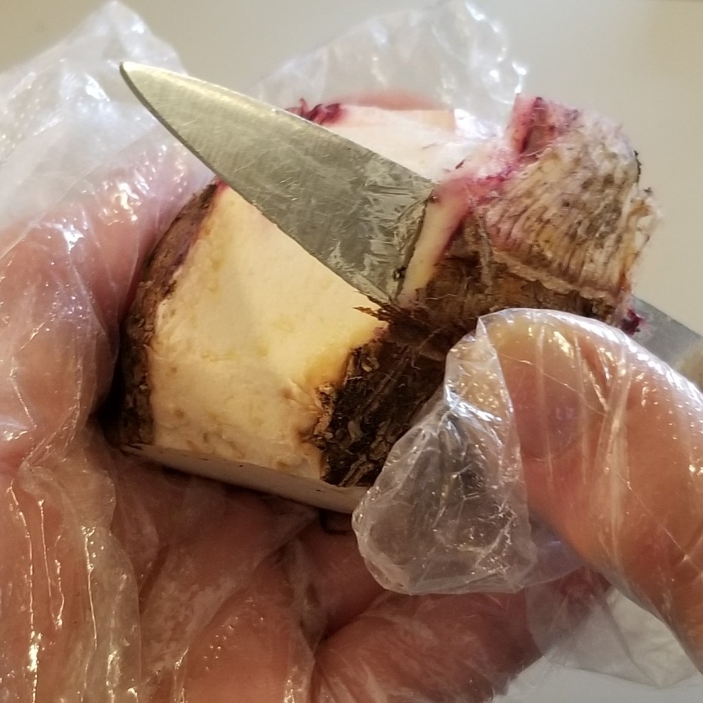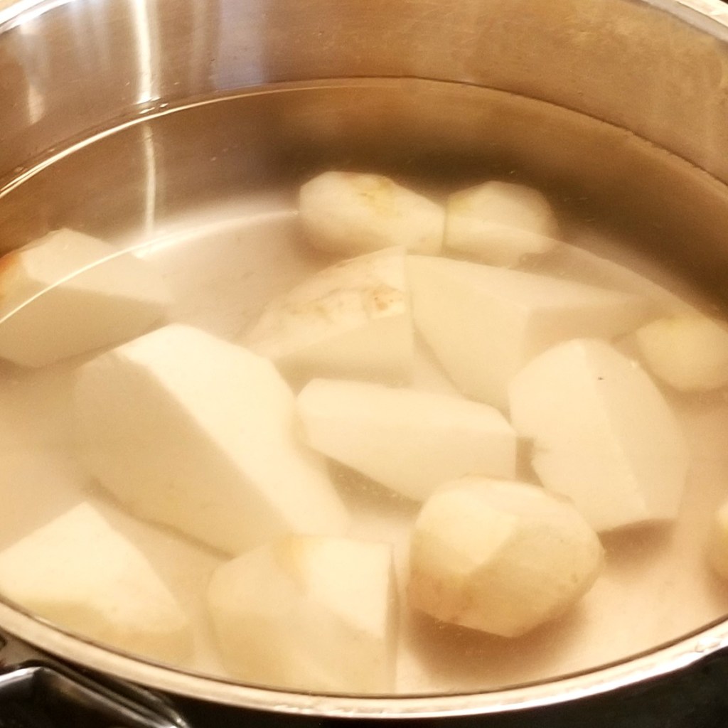 Malanga, taro, and eddo (satoimo) all contain toxic oxalates in their leaves and corms, which must be eliminated before eating. Oxalates are water soluble, so boiling and rinsing is a good cooking method. For this recipe, the cooked corms will be mashed, so first cut the raw corms into chunks, for shorter cooking time: