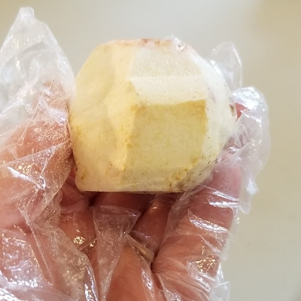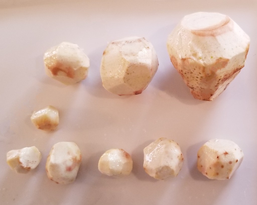 Discard ends, then, holding the round corm in one hand, very carefully peel, removing a band of skin from one end to the other, rotating and repeating (photo below, left). The fully peeled corm will have a polyhedral shape (photo below, right):