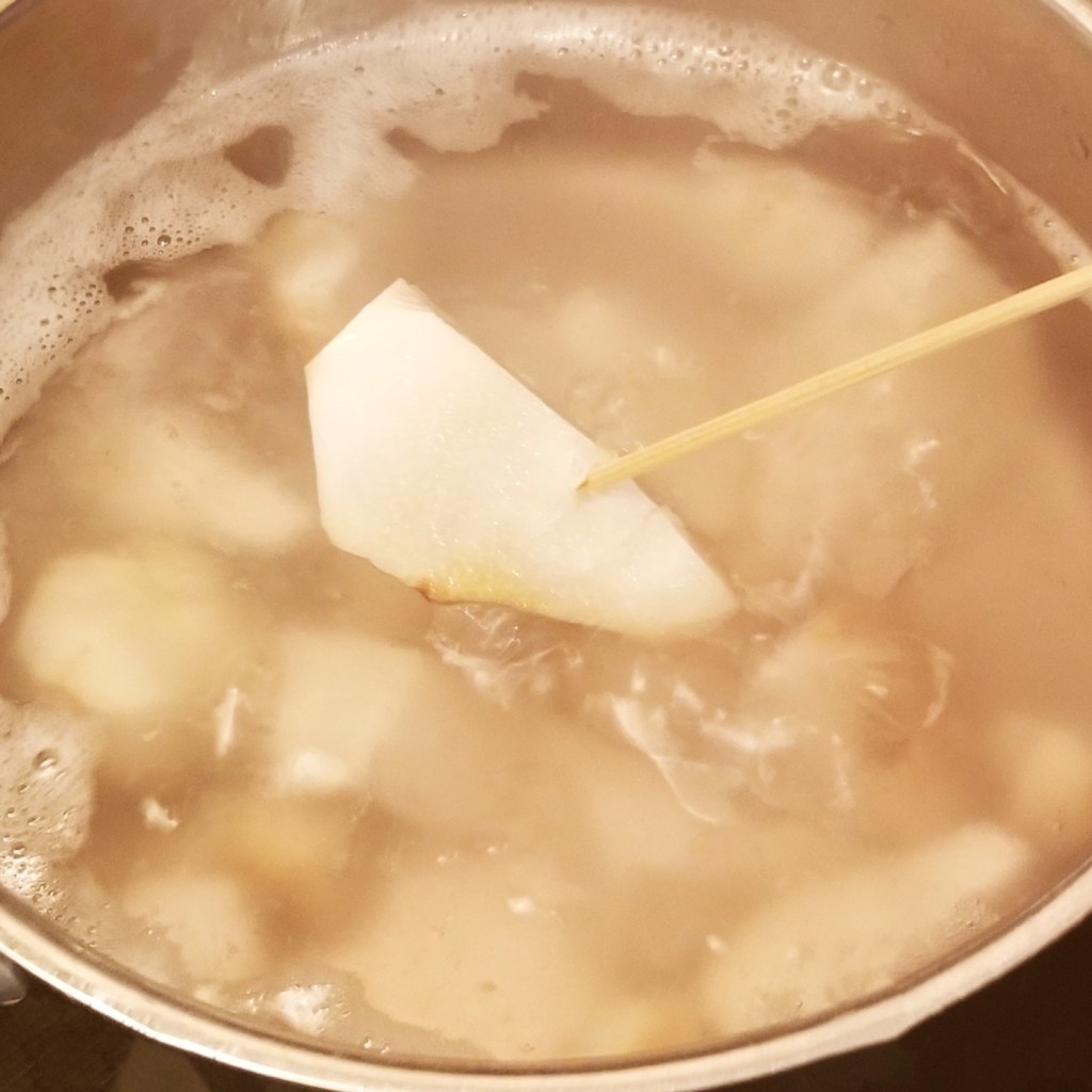 Place the chunks in a pot with water over high heat (photo below, left). Bring water to boil, reduce to medium heat, and cook for between ten to twenty minutes, until the largest chunk is tender, easily pierced with a fork or skewer (photo below, right):