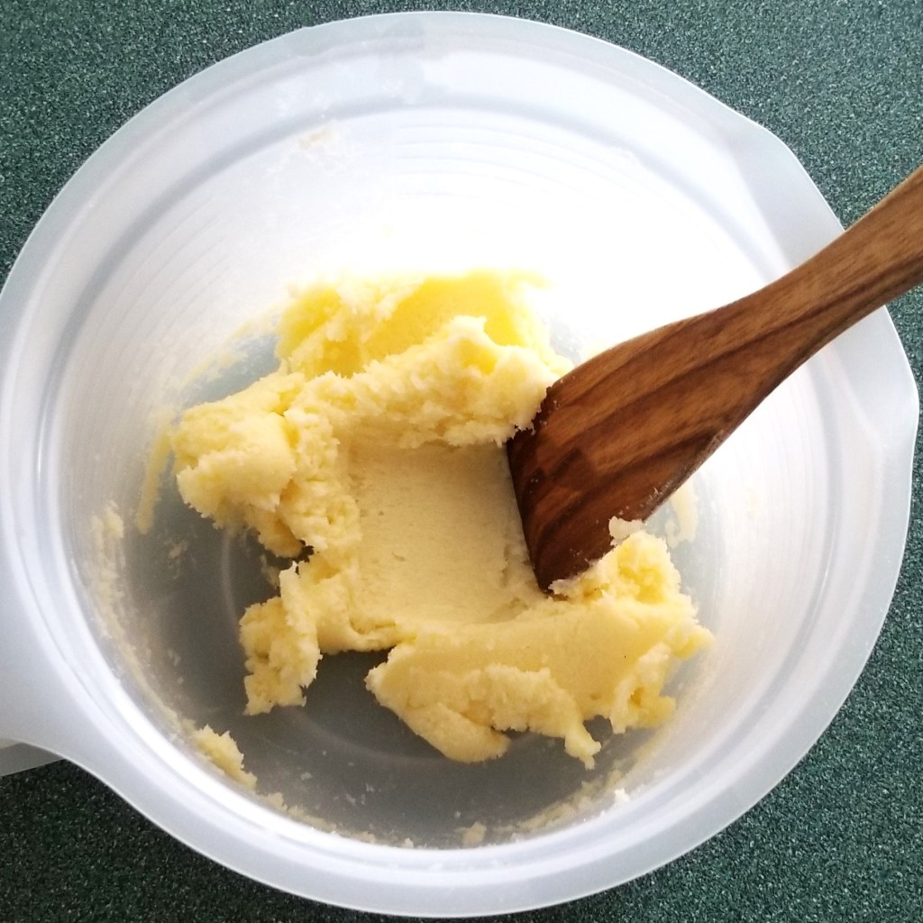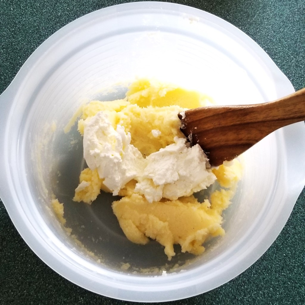 Beat butter and sugar in a mixing bowl, until sugar dissolves, and mixture is light and creamy (photo below, left). Incorporate cream (photo below, right):