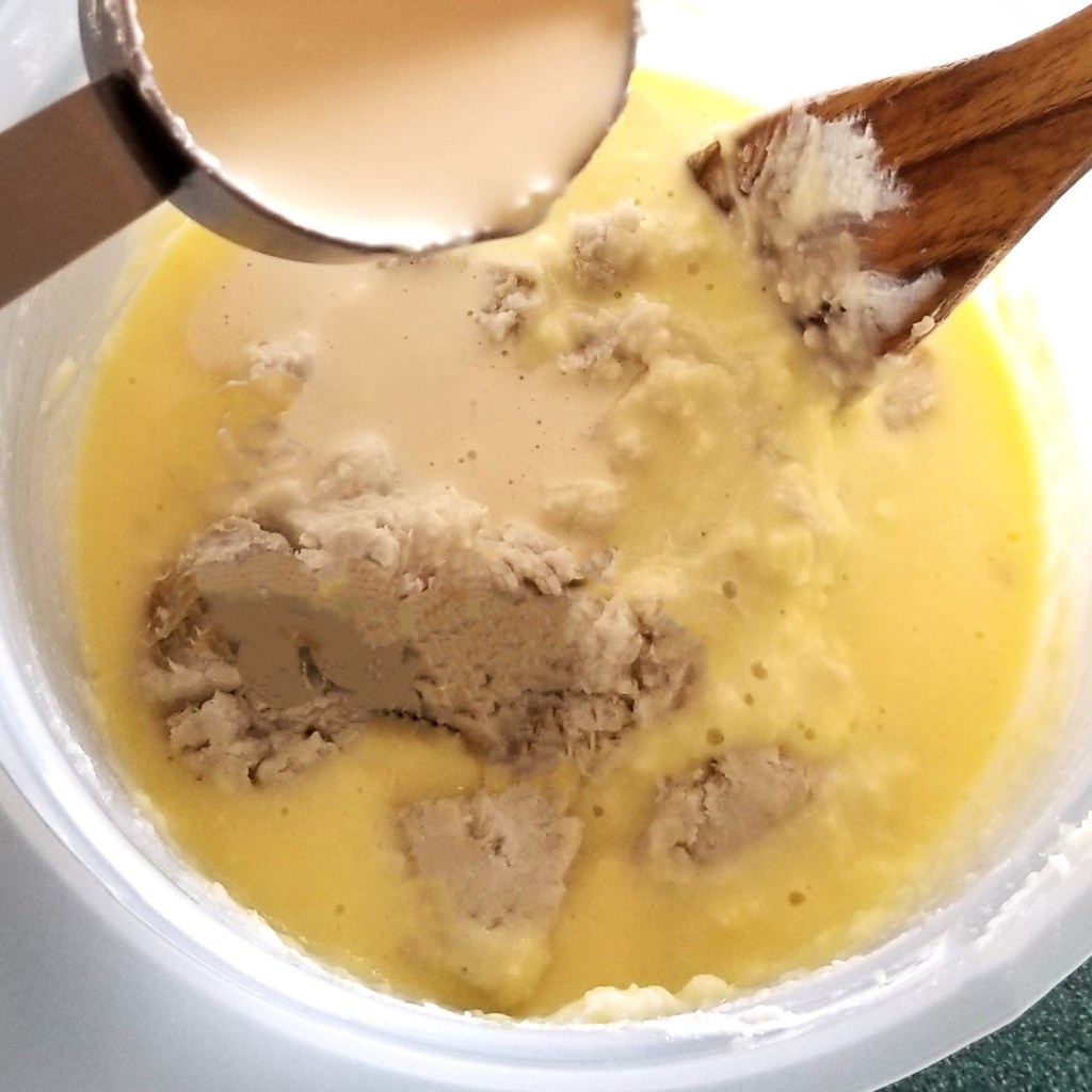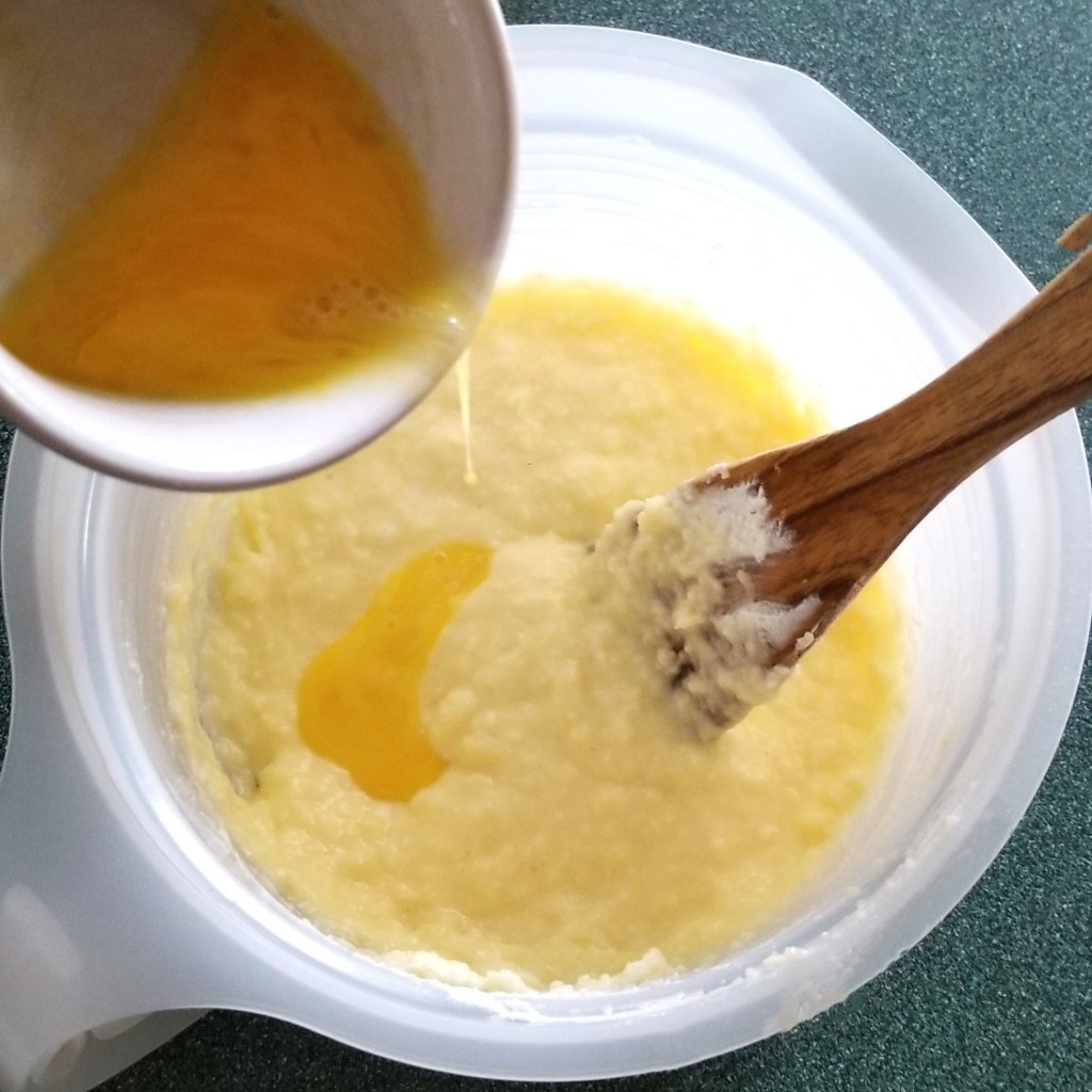 Slowly pour in eggs, while mixing (photo below, left). Add mash and mix vigorously, pouring in evaporated milk gradually (photo below, right):