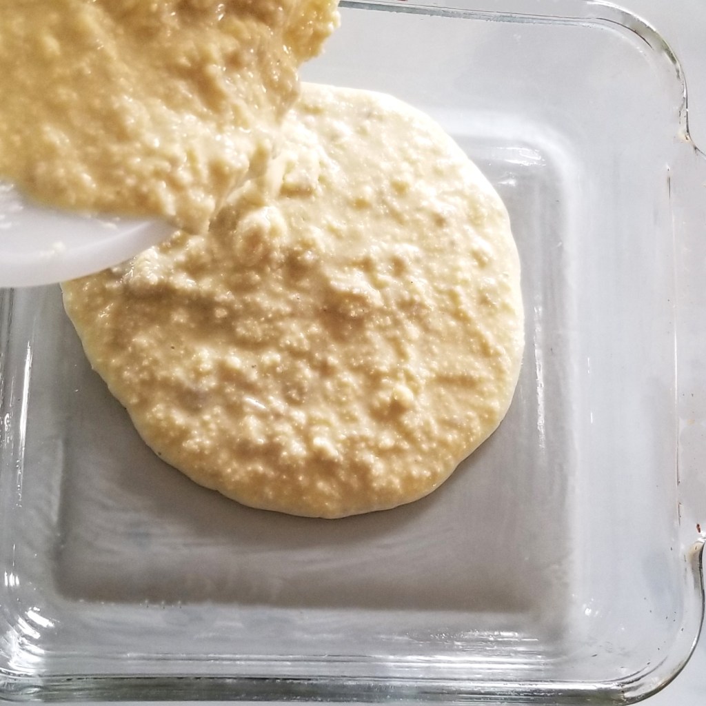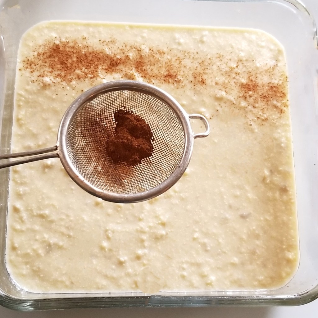Pour batter in greased baking dish (photo below, left). Sprinkle ground cinnamon on top, through a fine mesh (photo below, right):