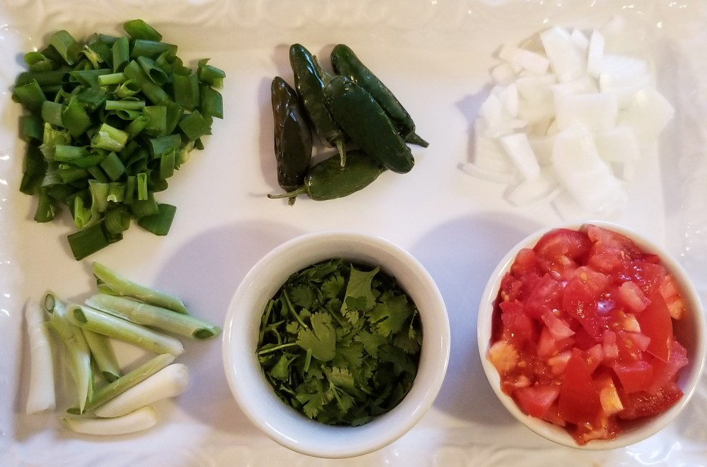 Prepare the veggies: wash and dry green onions, jalapeños, cilantro and tomatoes. Photo below, counter-clockwise from top left: chopped green parts of green onions, and white parts sliced into logs, chopped cilantro, chopped tomatoes, coarsely chopped white onion, whole jalapeño peppers: