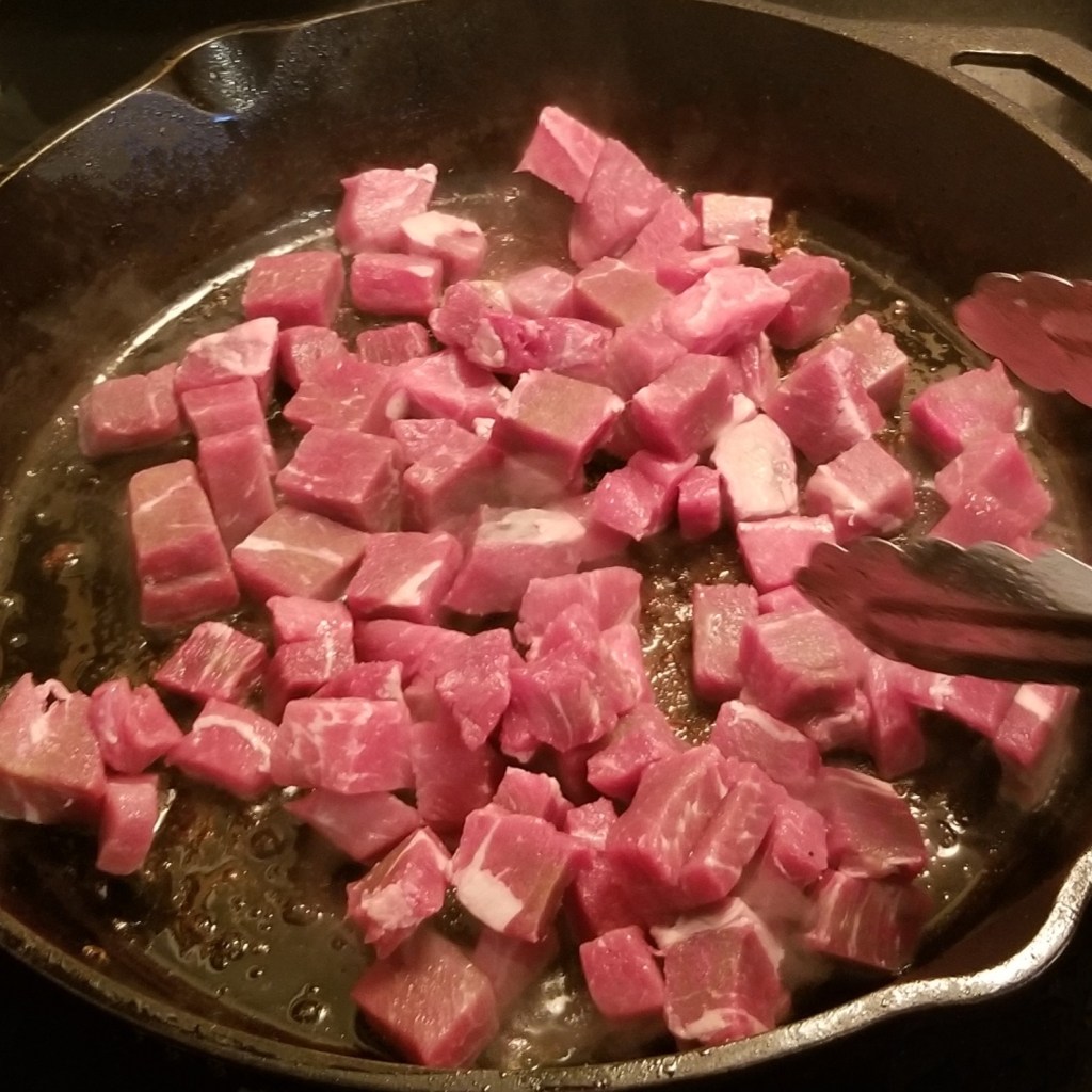When using a disco, as the different ingredients are cooked, they may be pushed to the side to cook another; when using a pan or iron skillet, have a second pan by the side, to reserve cooked ingredients. In a large pan or iron skillet over medium heat, add bacon, turning to cook on both sides (photo below, left); transfer to a second pan and reserve. Fry the beef chunks (and pork, if using) in the bacon fat (photo below, right):