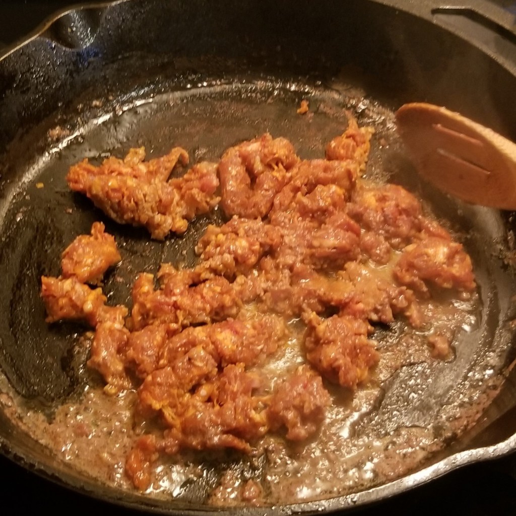 Turn beef chunks to brown all sides, then transfer to the second pan. Fry chorizo in the skillet, breaking up into chunks (photo below, left). Continue until fully cooked; transfer to the second pan, then drain and discard excess fast from the skillet. Return to medium heat, then add hotdog coins and ham squares (photo below, right):