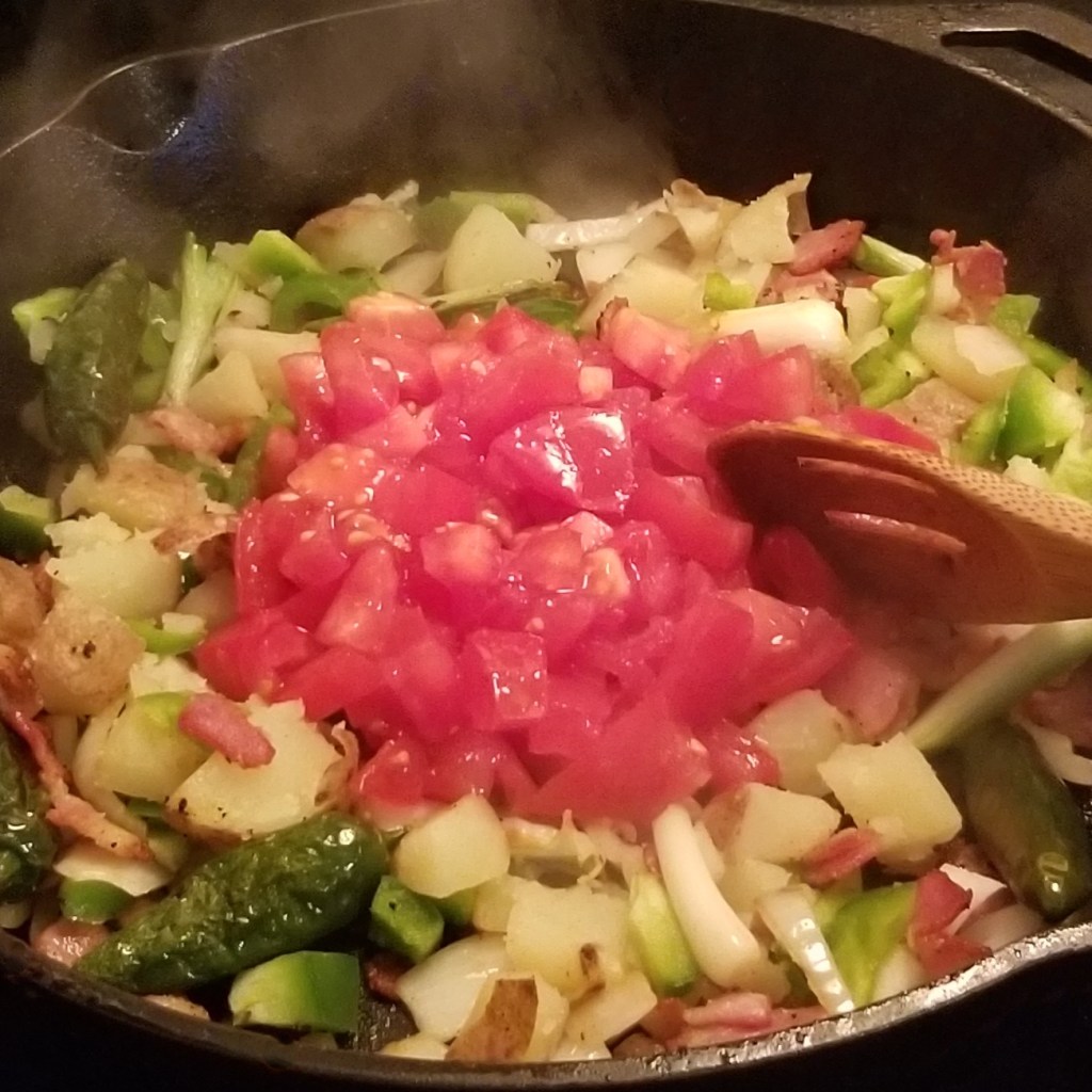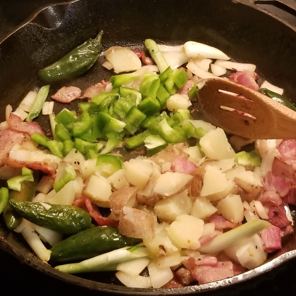 Return bacon to the skillet, and allow to crisp for one minute, to render a little more fat, then add white onions, white parts of green onions, and jalapeño peppers (photo below, left). Stir and cook until onions are translucent, then add any extra veggies, optional, in my case, cooked cubed potatoes and chopped bell peppers (photo below, right):
