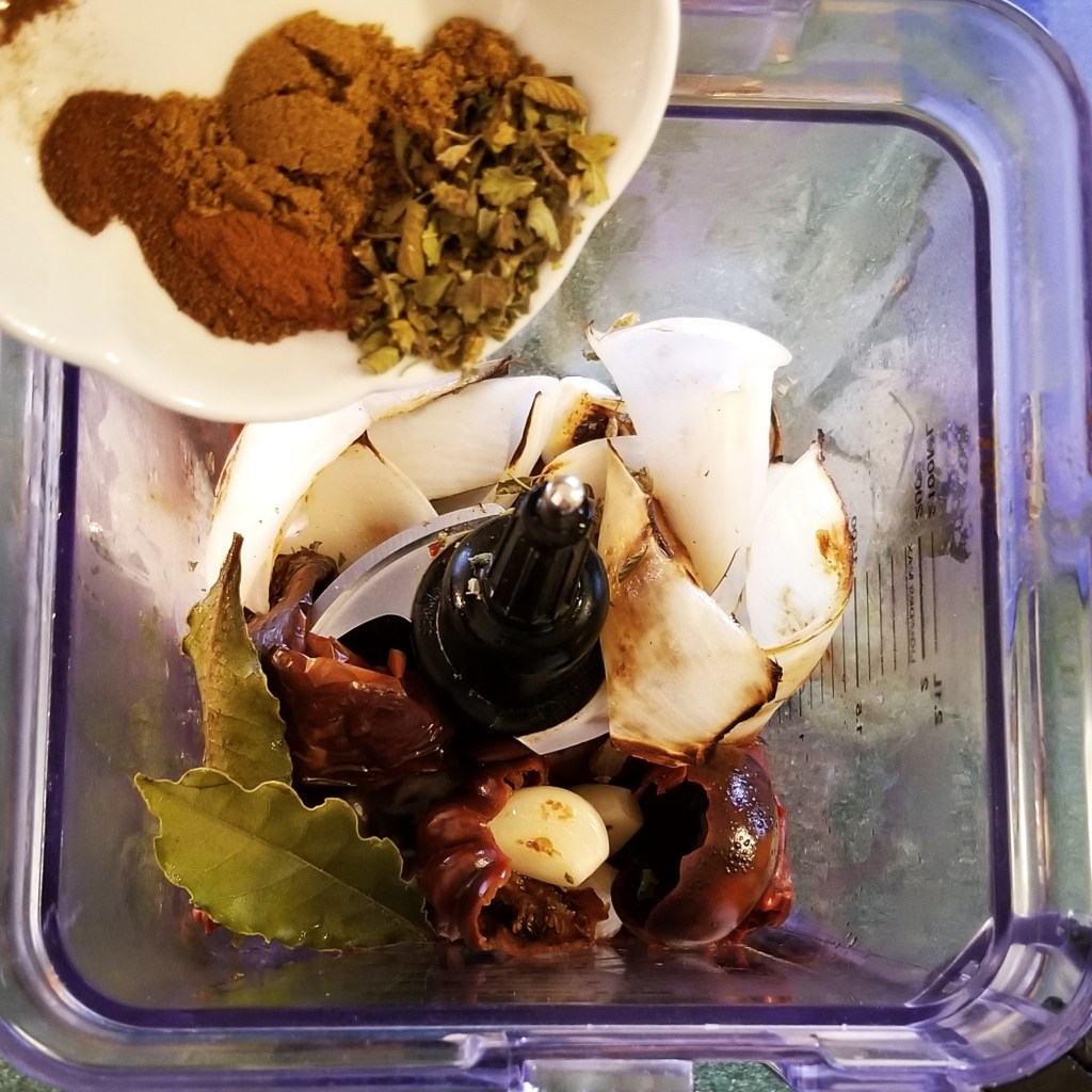 Remove skillet from heat, and transfer onions and garlic to a blender jar; add cooked peppers and bay leaves, then the measured spices (photo below, left). Add one cup of liquid from cooking the peppers (photo below, right):