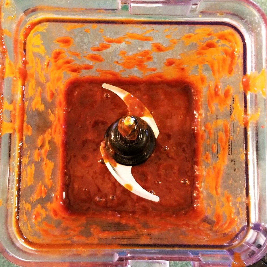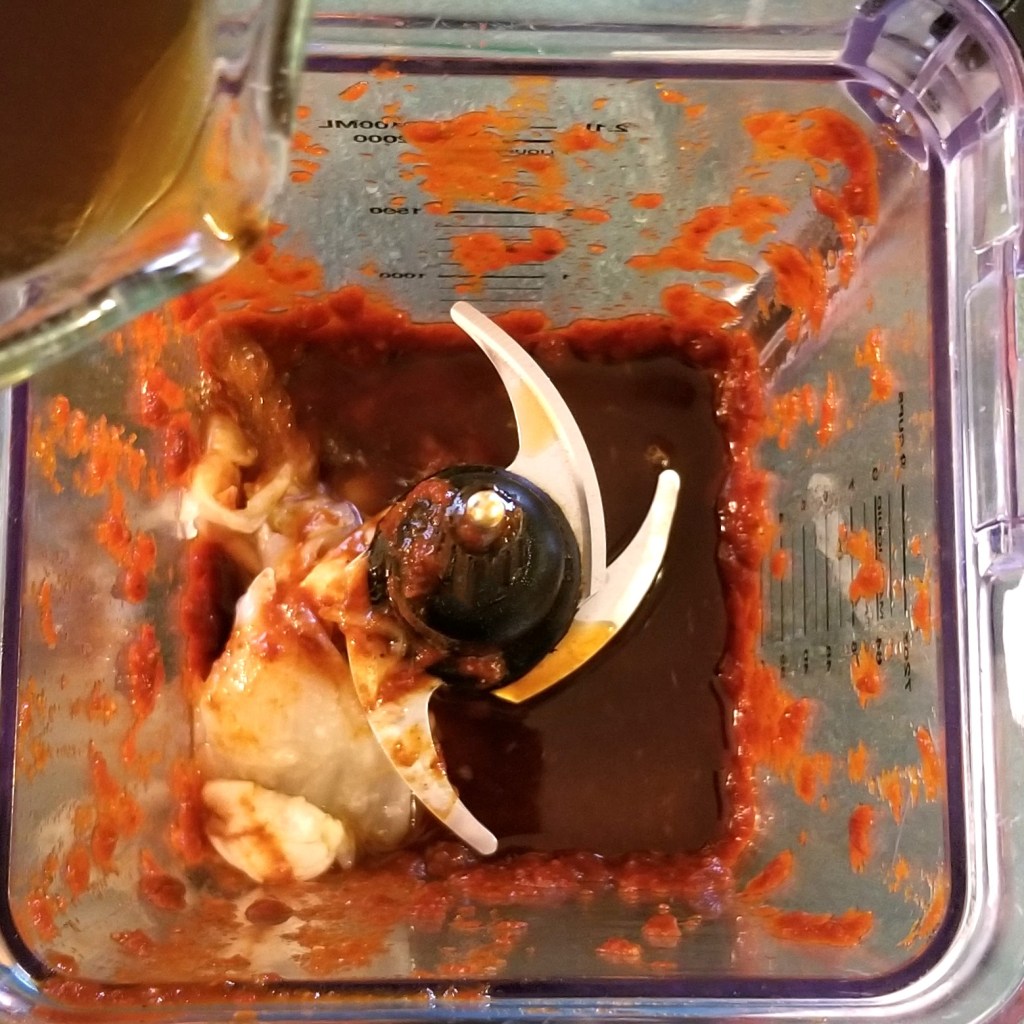 Add the onion and garlic to the blender jar, and then the rest of the liquid from cooking the peppers (photo below, left). Process again, until smooth (photo below, right):