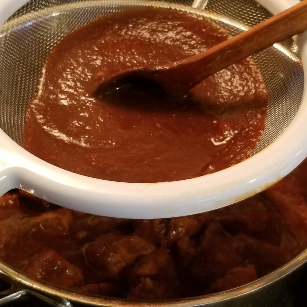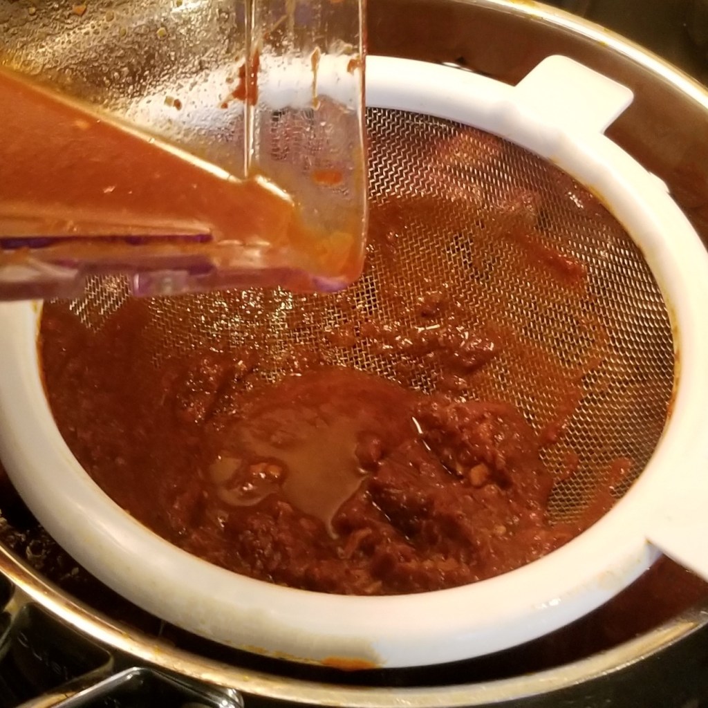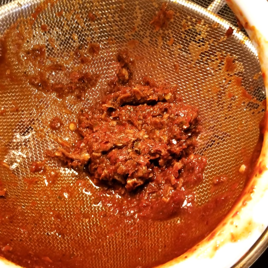 Add half a cup of water to the blender jar, to collect any remaining sauce, and add to the pan, through the mesh (photo below, left). Discard solids collected in the mesh (photo below, right):