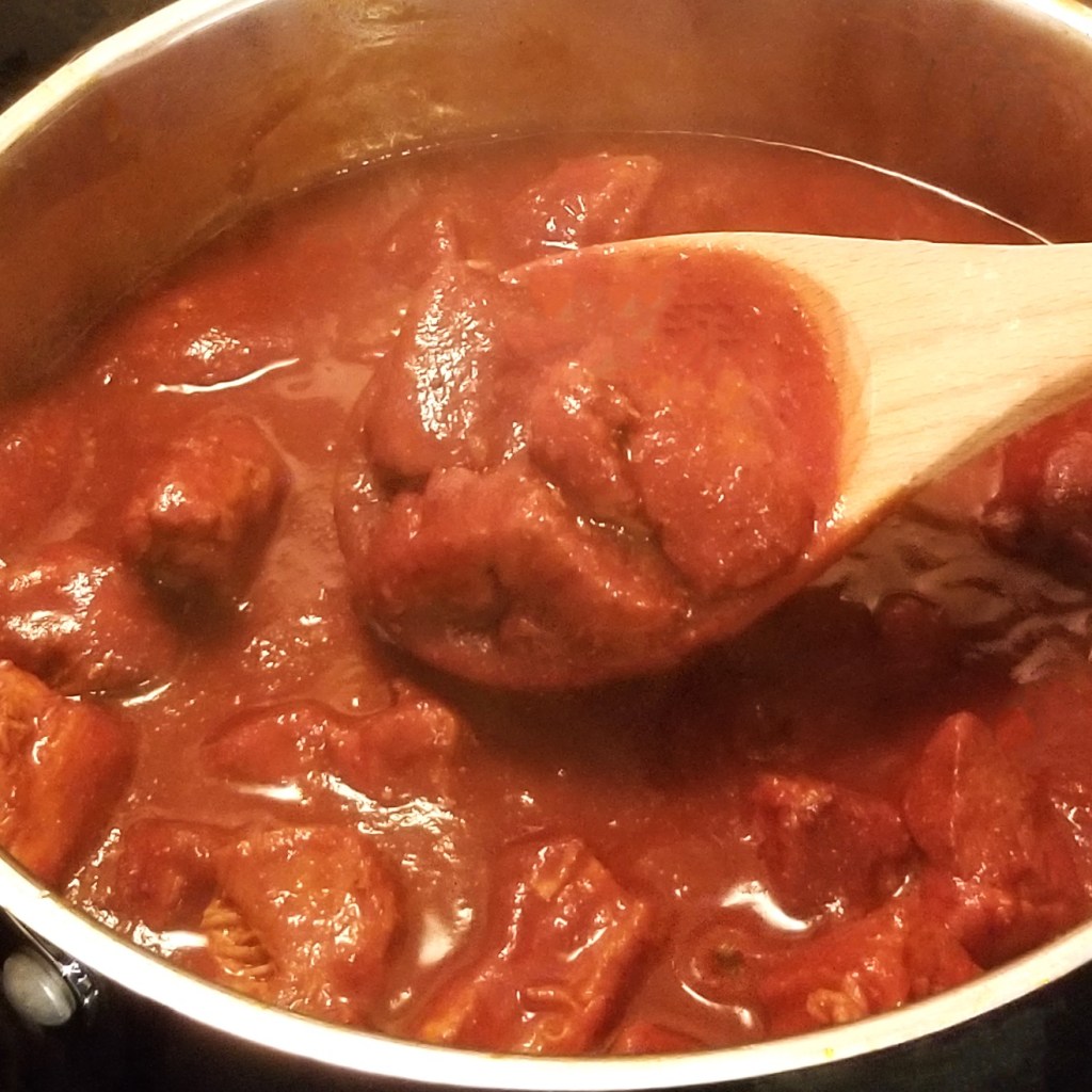 Bring to a boil, then reduce heat to a simmer, and continue cooking (photo below, left), until the sauce has thickened (photo below, right):