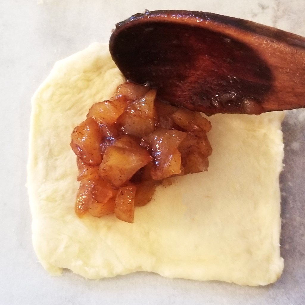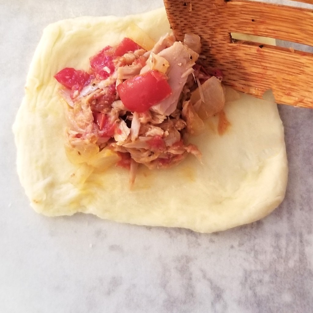 Working with one square at a time, place about two tablespoons of filling of choice at the centre. In the photos below, from left to right, tuna fish filling, roasted poblano pepper strips and Chihuahua cheese , and apple filling: