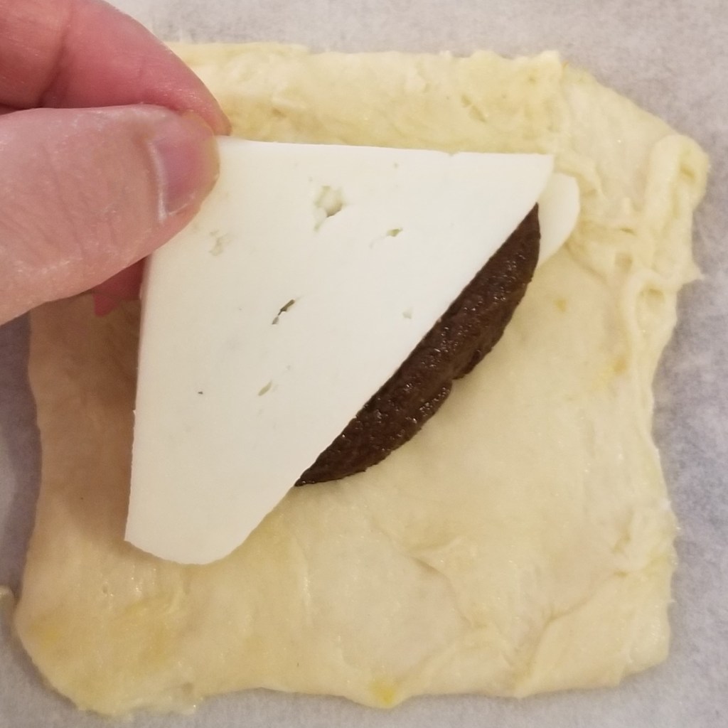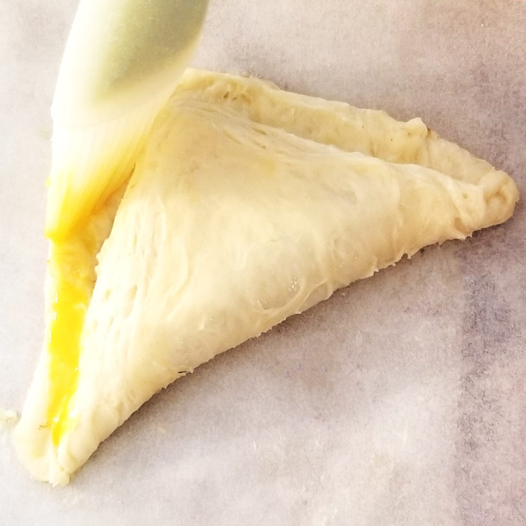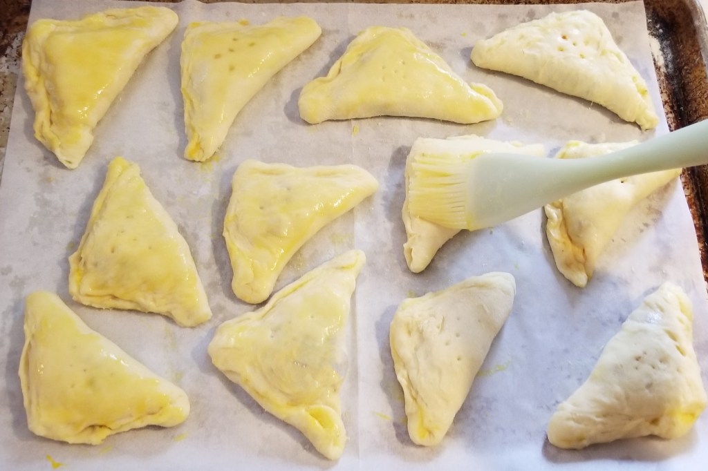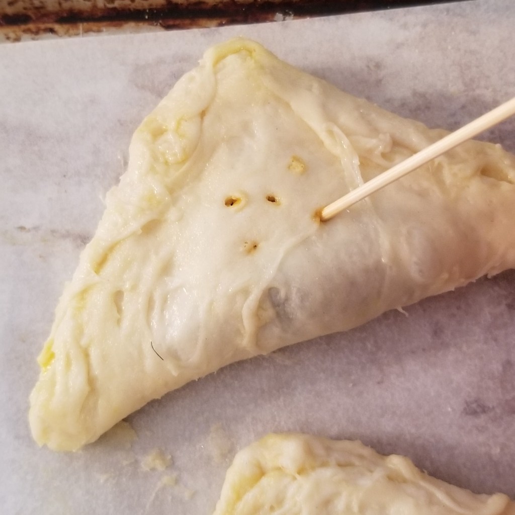 Close square over filling to form a triangular shape, leaving a narrow edge on the bottom layer; brush edge with reserved egg (photo below, left). Fold edge over top layer, pressing down to seal and form the patty. Place on prepared baking sheet, then poke in a few spots with a toothpick, to release steam during baking (photo below, right):