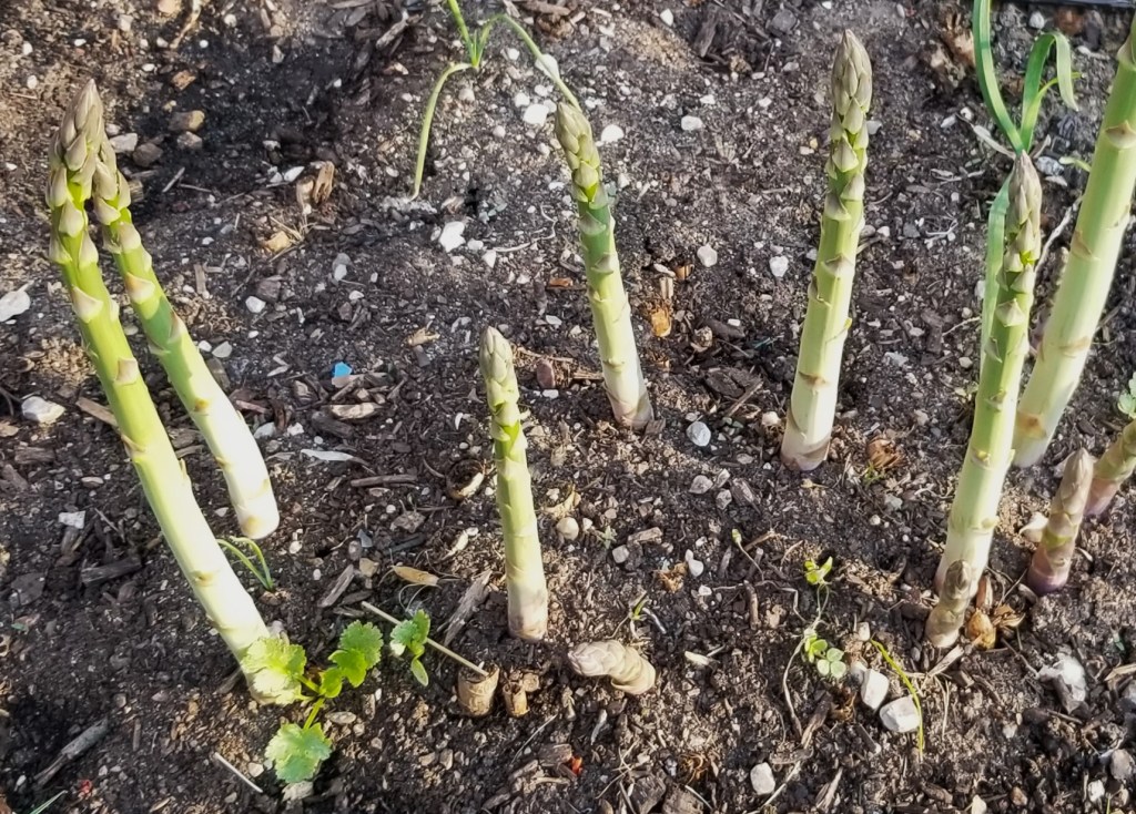 Asparagus (Asparagus officinalisare perennial plants that grow well in gardening zones 3 to 8.  The shoots are harvested before their tips fully open, and are prepared as a delicious and nutritious spring vegetable.  I planted a couple of crowns near the northern fence of my 6B garden in 2013, where they get plenty of sun and good protection from strong winds.  The first year, the shoots were allowed to grow tall and develop into fronds of close to seven feet (over 2 m) in height. The second year, I harvested spears for just a couple of weeks, cutting them at soil level with a very sharp knife.  And after that, harvest has been rewarding; it might start as early as mid-April, often the first crop of the outdoor gardening season: