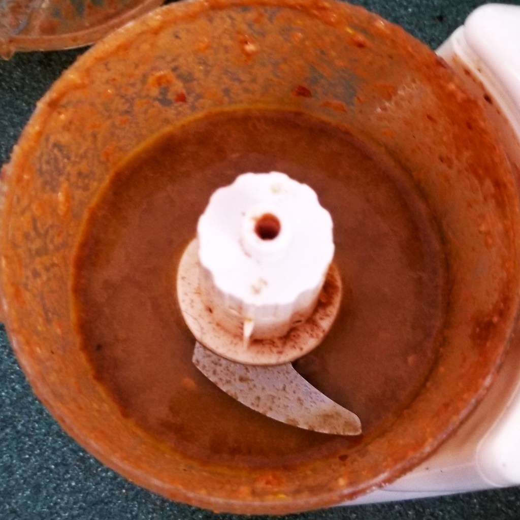 Prepare Red Dipping Sauce (mojo de chile de árbol): place all ingredients, except oil, in a mini food processor or compact blender (photo below, left); pulse a few times, to break up the peppers and garlic, then gradually add oil, and continue pulsing (photo below, centre). Finish by blending for about one minute (photo below, right):
