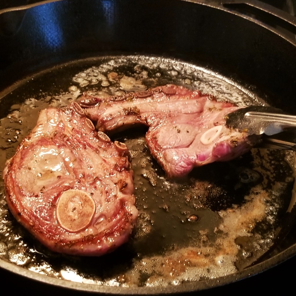 Right before serving, warm up olive oil in a thick skillet, over medium/high heat. Add butter and stir, to melt (photo below, left). Add lamb, two pieces at a time, and cook, undisturbed, for three minutes (photo below, centre); flip and cook for another three minutes, seasoning with salt and pepper, to taste (photo below, right):