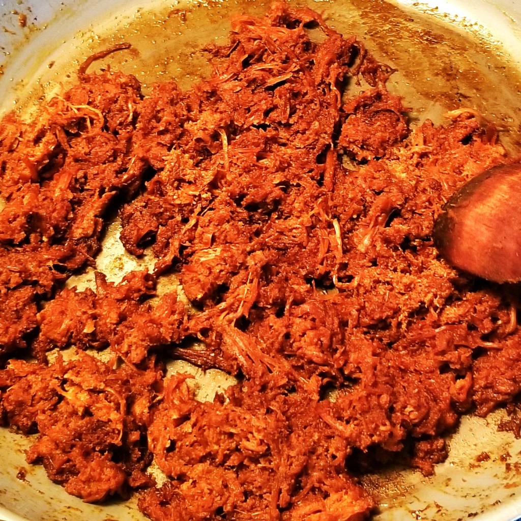 Prepare protein of choice: cooked and shredded chicken breast; grilled steak; broiled or fried sliced tofu; or pork, either pulled, carnitas, chorizo, or in this case, chilorio (click here for full recipe):