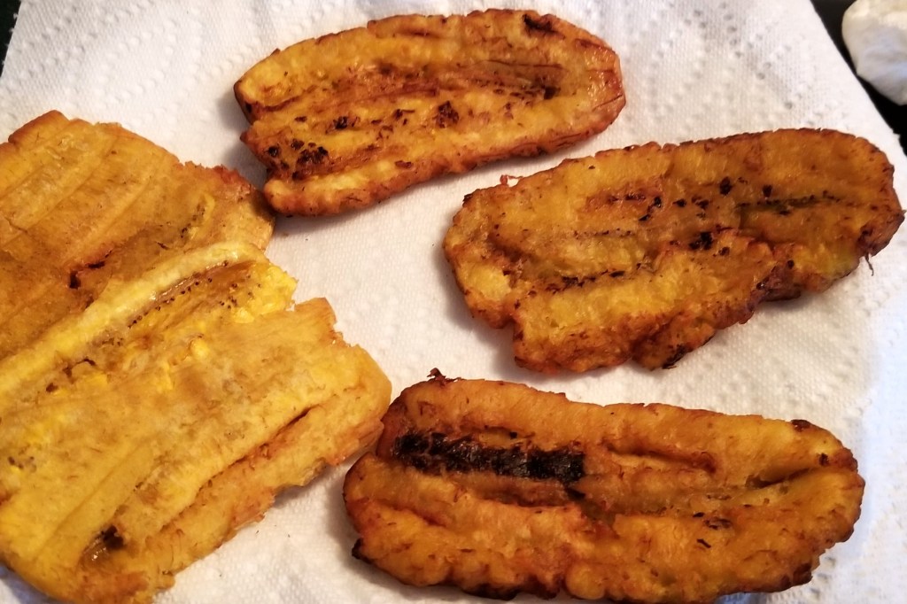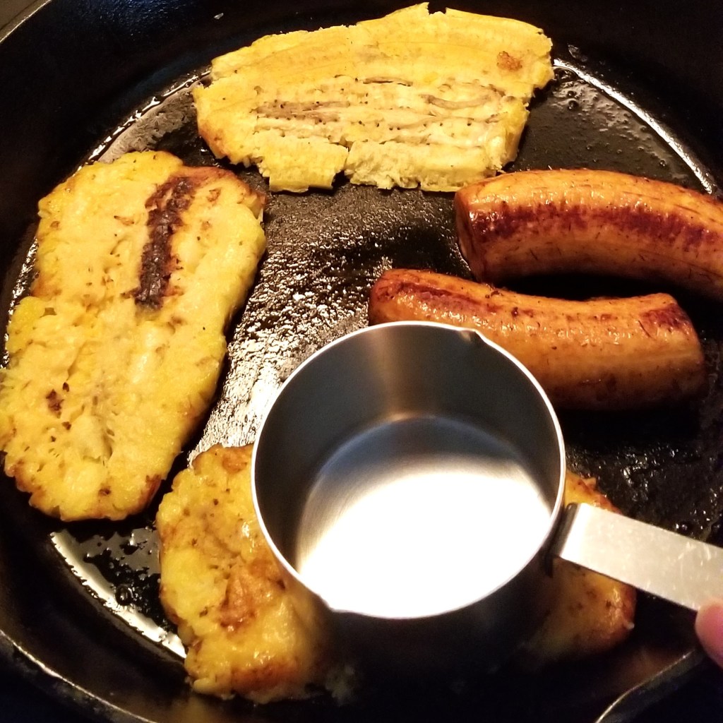 Pour enough oil into a small pot to have about two inches (5 cm) in depth. Bring to about 360ºF (182ºC). Fry the plantain halves for just one minute, turning to crisp all around. Remove onto a heatproof board or frying pan, then flatten while still hot, with a spatula or other utensil (I used a metal measuring cup with flat bottom, photo below, left). Return flattened pieces to the hot oil, frying one by one, and flipping to brown on both sides (photo below, right):