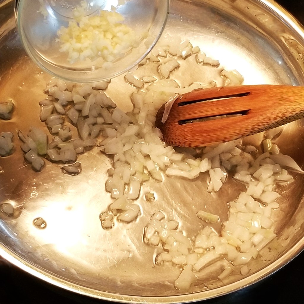 Prepare filling: Warm up oil in a frying pan over medium heat; add onions and sauté until translucent, then add garlic (photo below, left).  Stir and continue cooking for thirty seconds, then add ground meat or plant-based product, breaking up with a spoon (photo below, right):