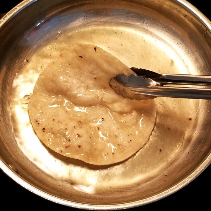 Prepare taco shells: Pour enough oil in a frying pan to cover the bottom, to a depth of about a quarter inch (6-7 mm); place pan over high heat, until oil is hot, then reduce heat to medium.  Working with one tortilla at a time, place in the hot oil (photo below, left), then immediately flip, folding in half with tongs (photo below, right):
