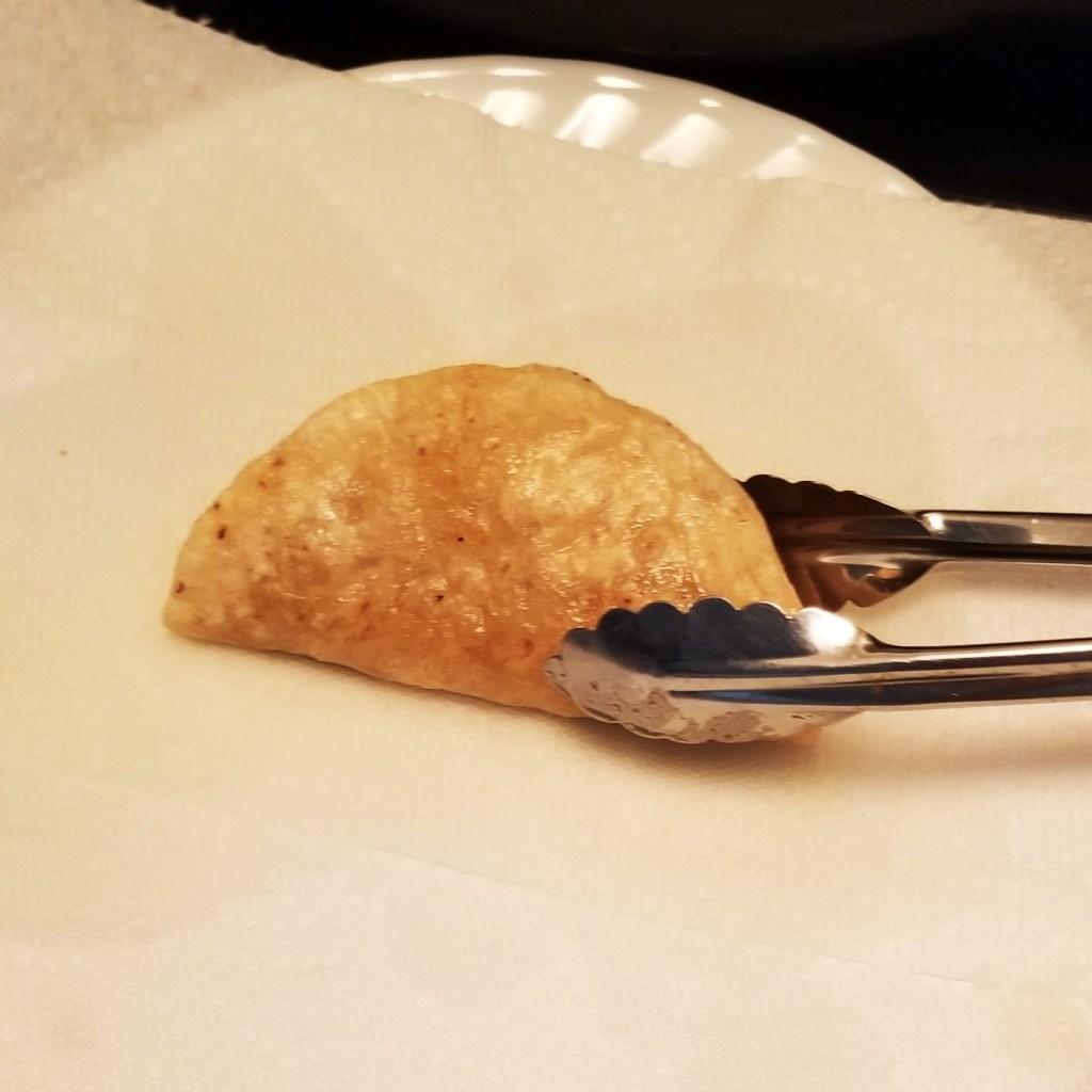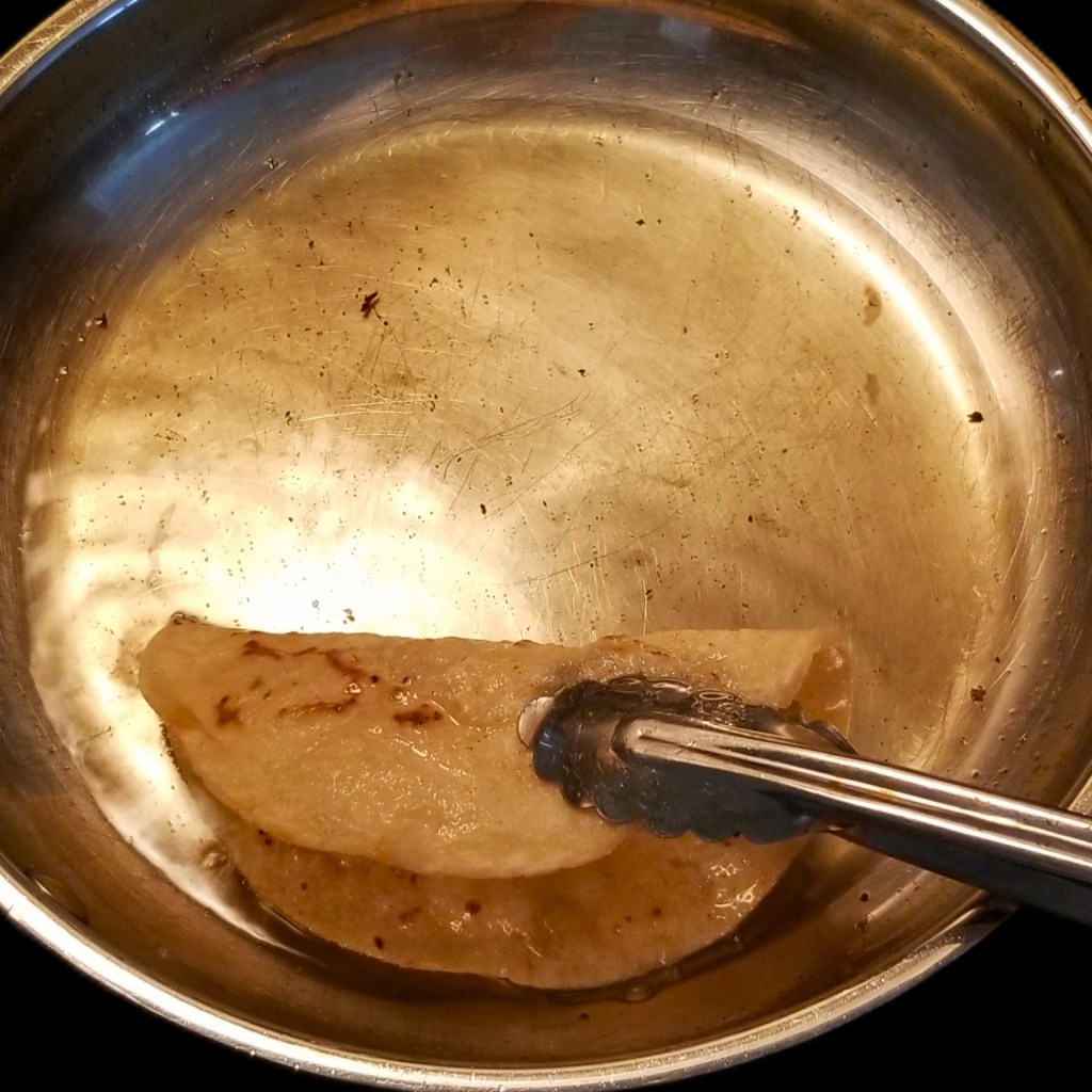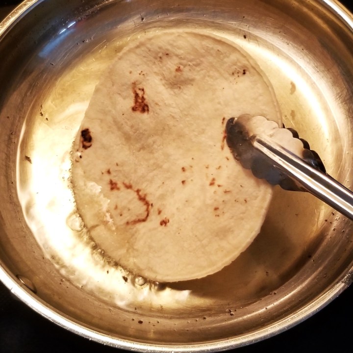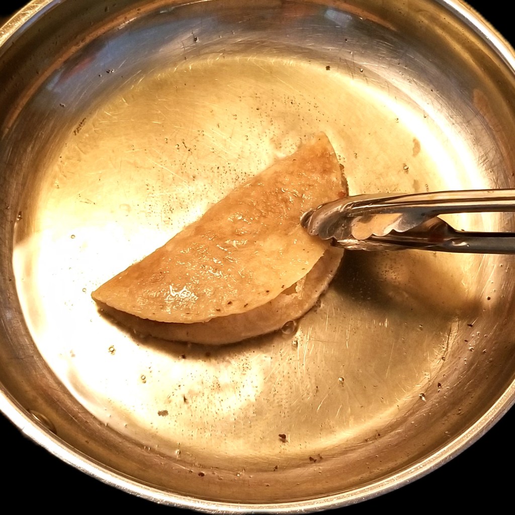 Bring folded tortilla to the edge of the pan, and keep top half lifted with the tongs, to form the characteristic arched shape of the shell (photo below, left); after a few seconds, flip to crisp the other half, keeping the arched shape with the tongs (photo below, right):