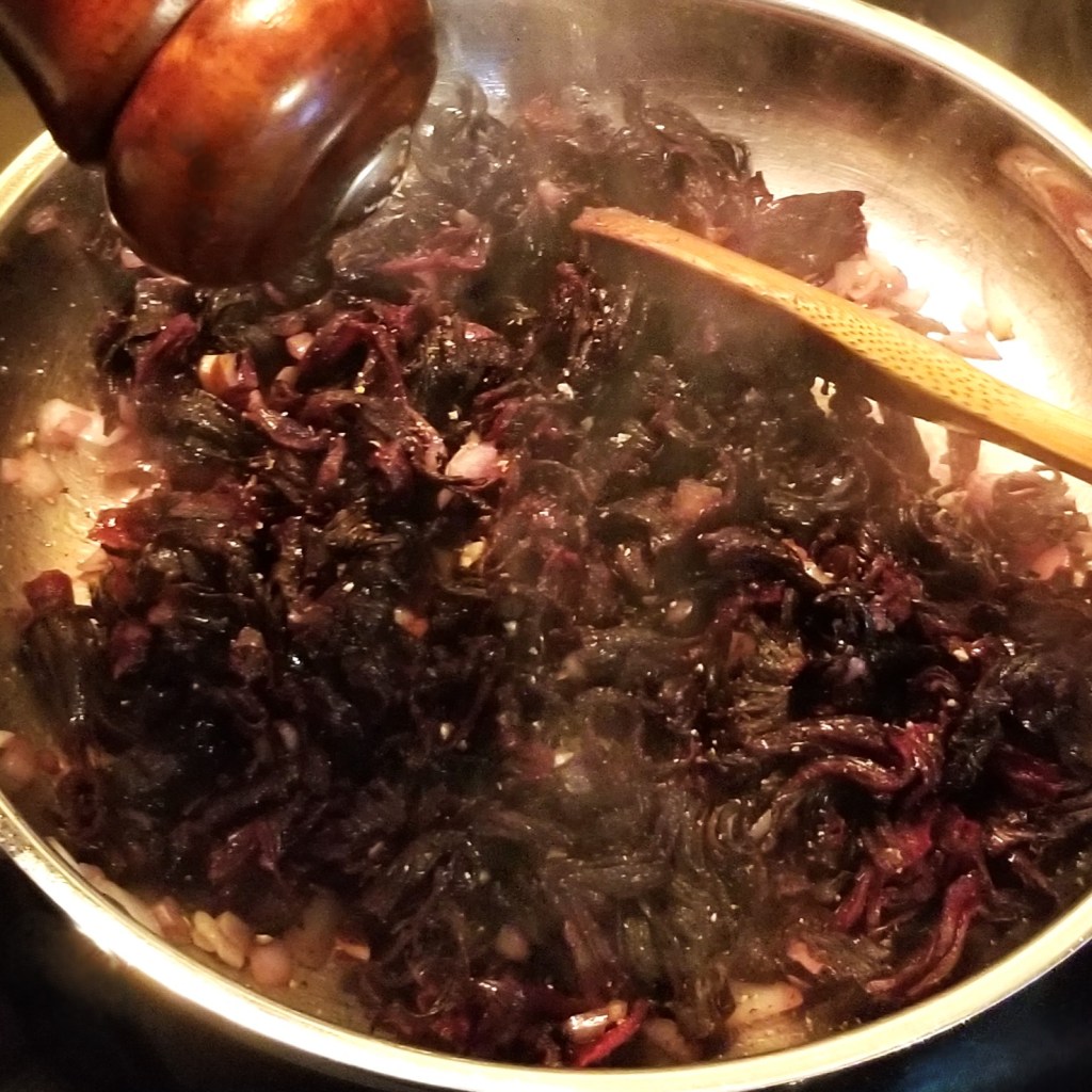 Mix to incorporate, and continue cooking for five minutes; mix in garlic, and season with salt and pepper, to taste (photo below, left). Taste a piece of hibiscus to test texture, and continue cooking and tasting every two minutes, until the hibiscus becomes a tender, pleasant bite. My batch took a total of ten minutes. Adjust seasoning with more salt and pepper, and (optional) add a splash of bottled sauce for extra flavour; Maggi™ or Cholula™ keep the dish vegetarian, but in this case, I used Worcestershire* (photo below, right):