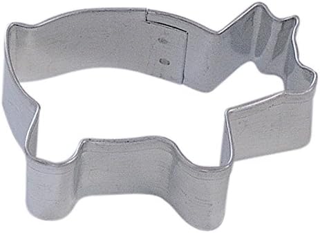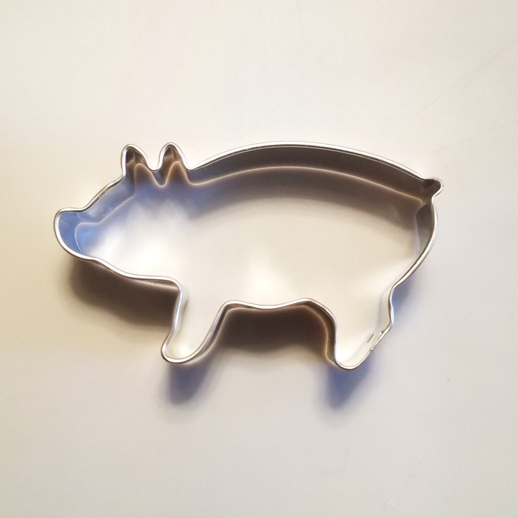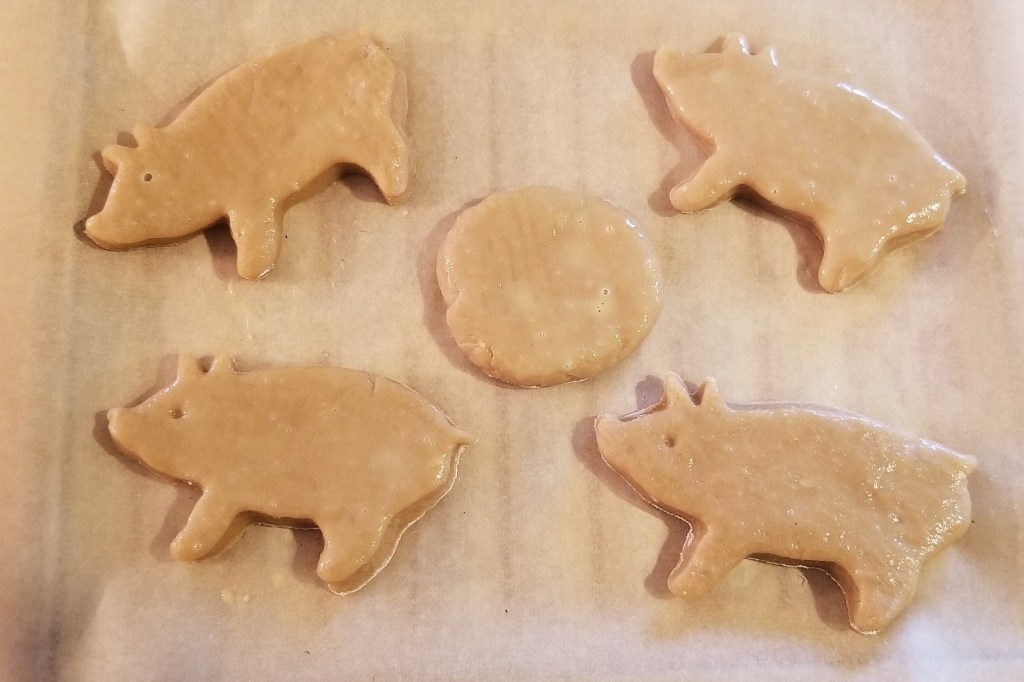 Take dough out of the fridge and unwrap; working with about one third of the dough at a time, roll on lightly floured surface to a thickness of approximately 1.25 cm (half an inch, photo below, left). Cut out piggies, running a knife around the template, or using the cookie cutter (photo below, right):