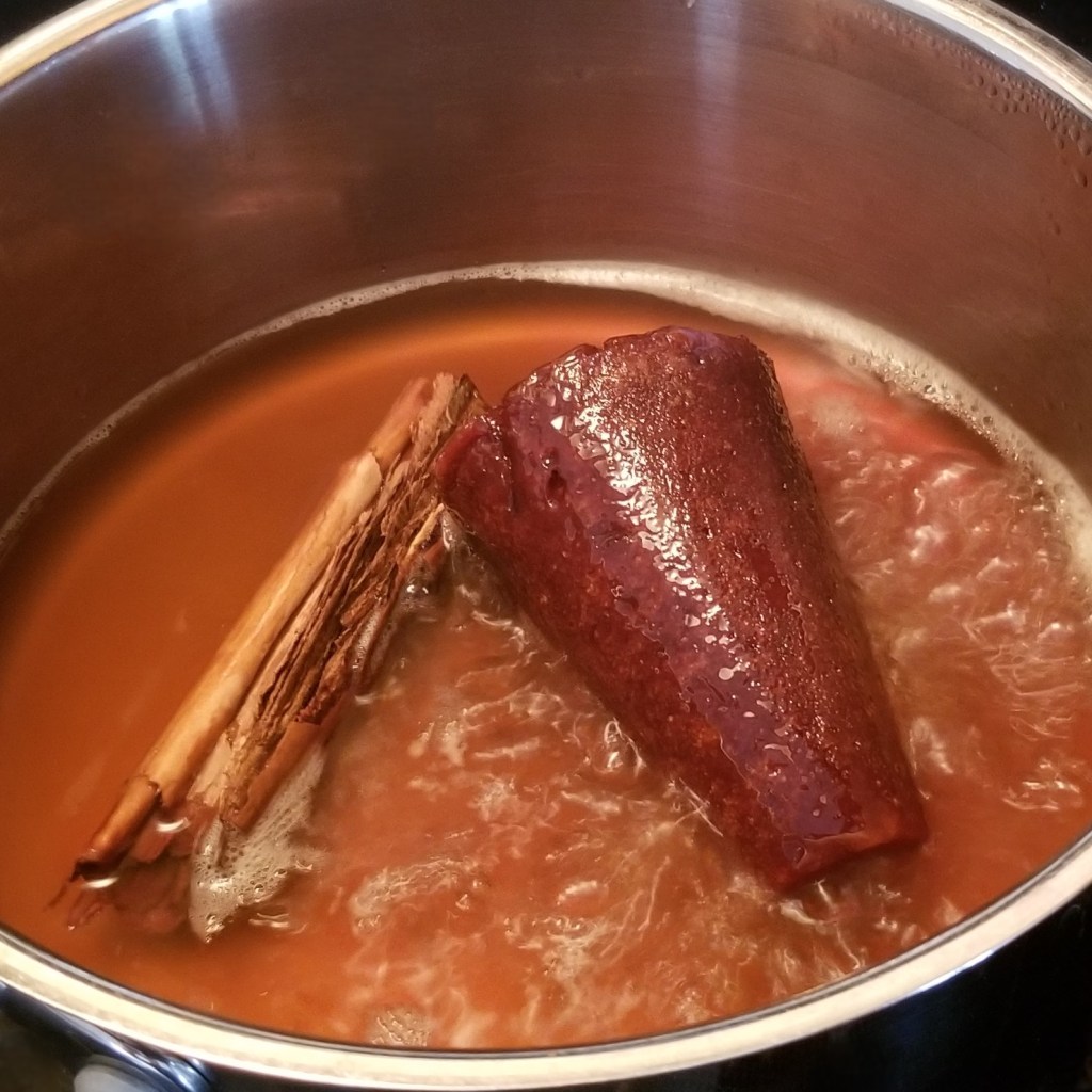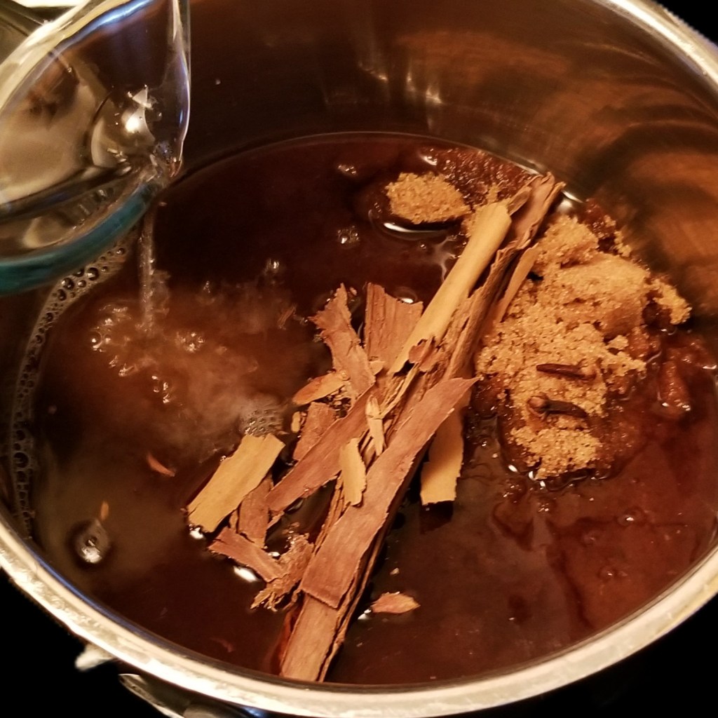 Place brown sugar, cinnamon stick, and whole cloves in a saucepan, then add water (photo below, left with piloncillo, right with granulated):