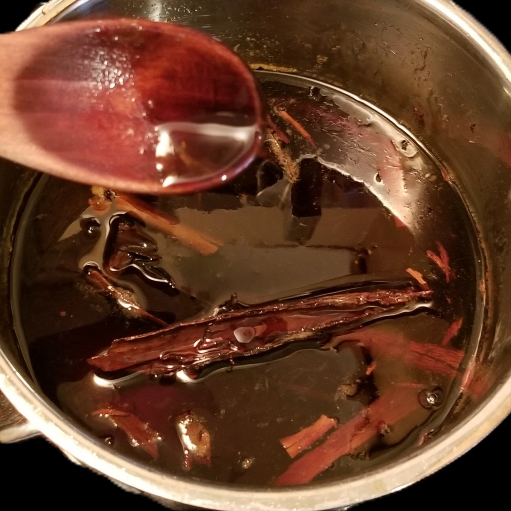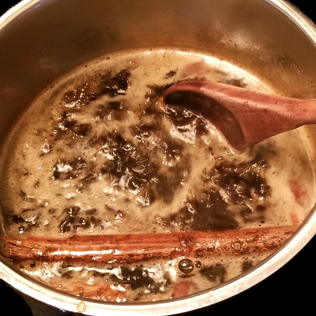 Place saucepan on stove over high heat, and bring mix to boil; continue cooking, stirring occasionally, until sugar has dissolved (photo below, left). Remove from heat and allow the dark syrup to cool down (photo below, right):