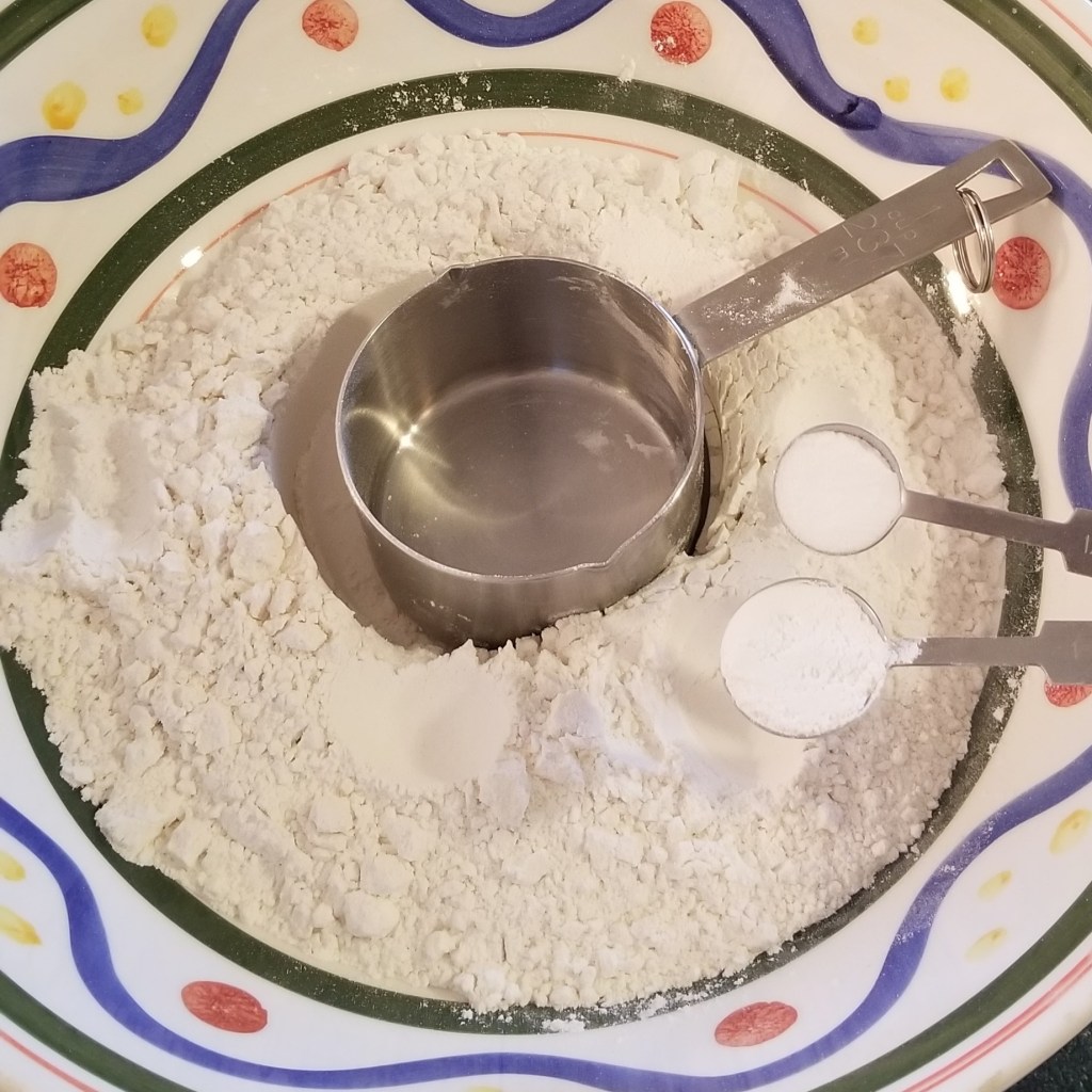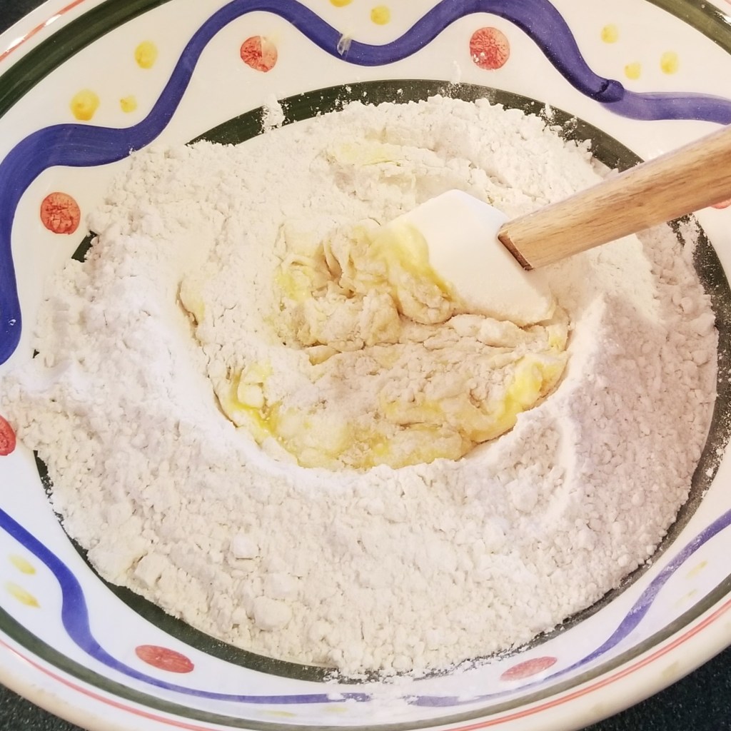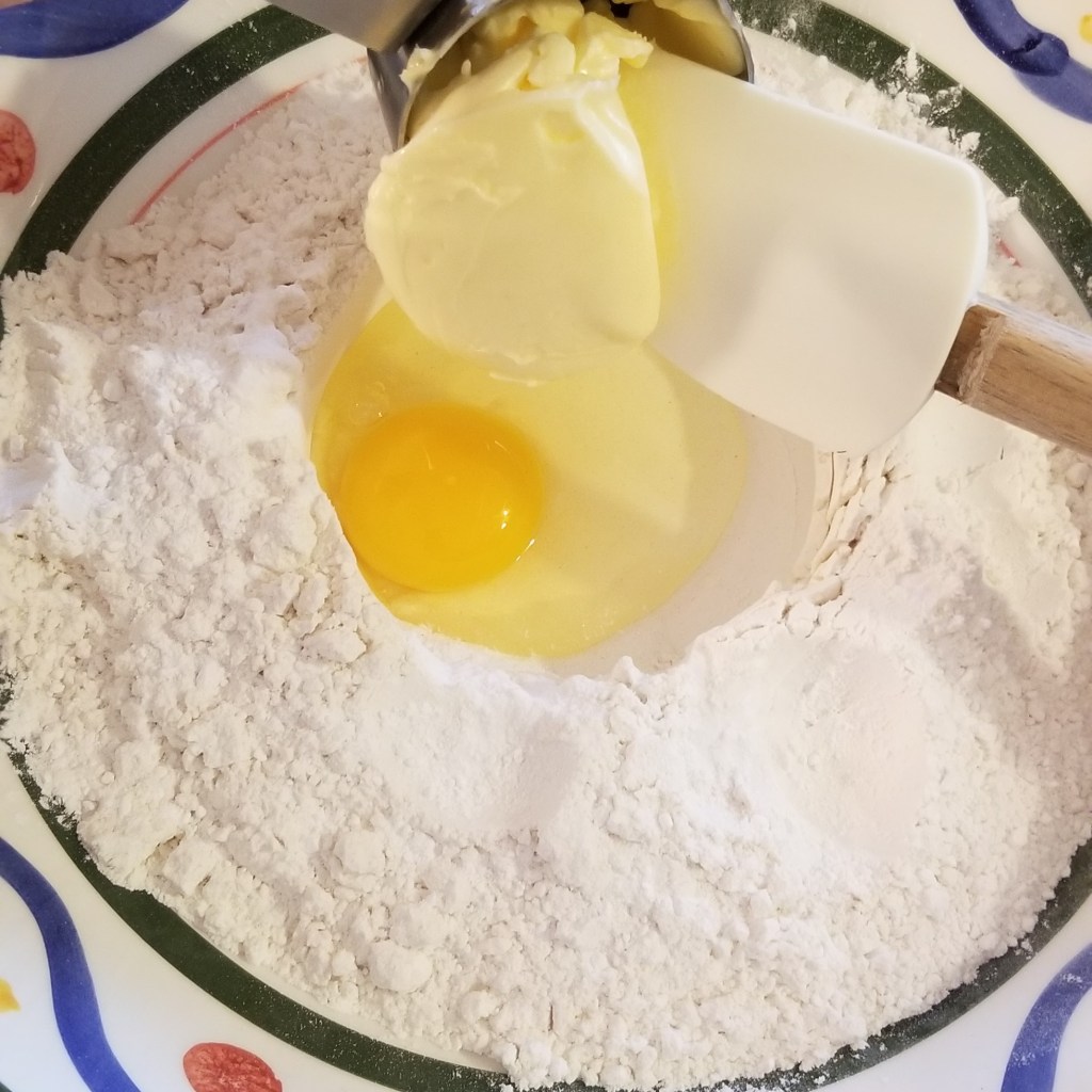Place flour, baking soda and baking powder in a large mixing bowl, making a well in the middle (photo below, left). Add one egg and the fat to the well (photo below, right, with margarine):