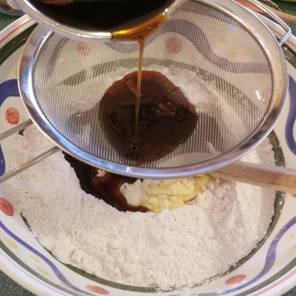 Beat the egg, then mix with fat, and slowly incorporate some of the dry ingredients (photo below, left). Strain cooled syrup onto the mix (photo below, right):