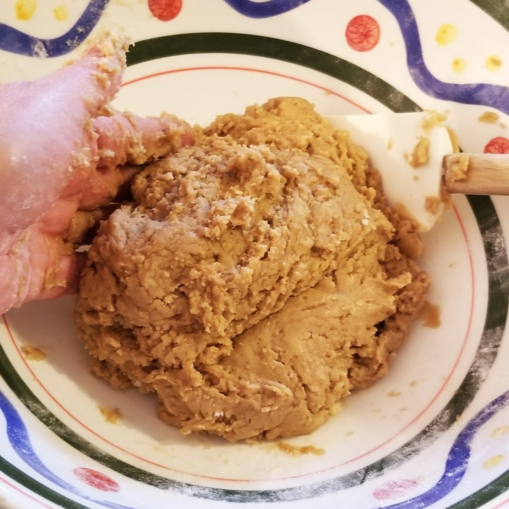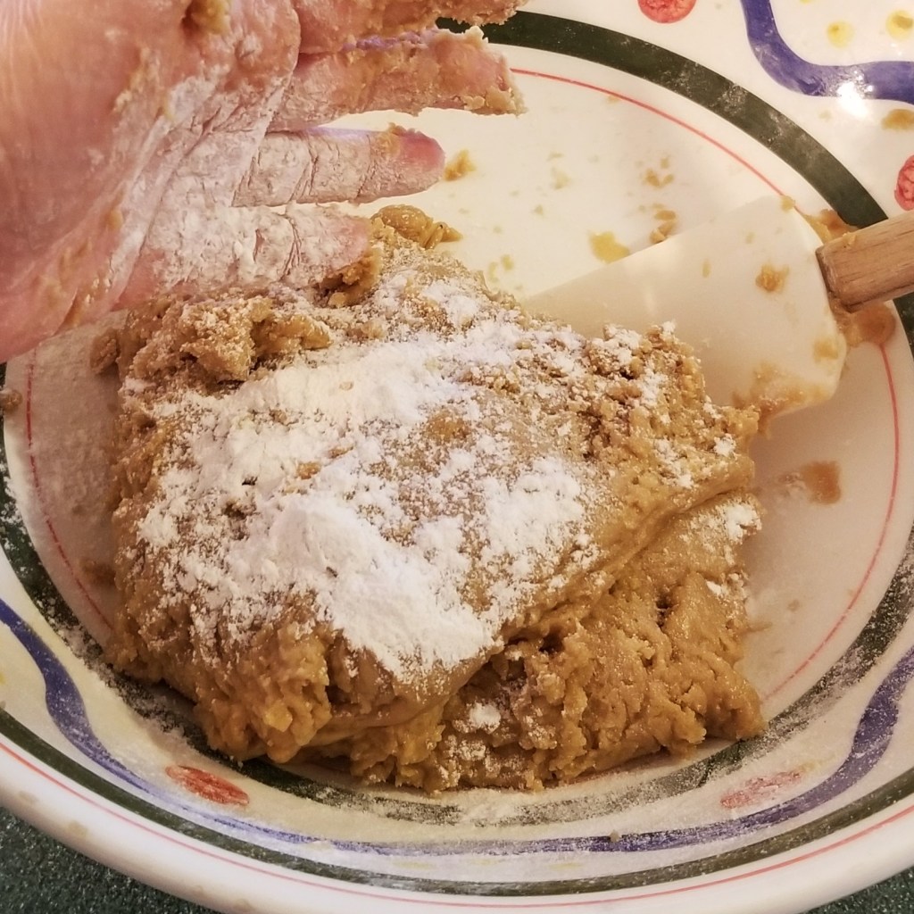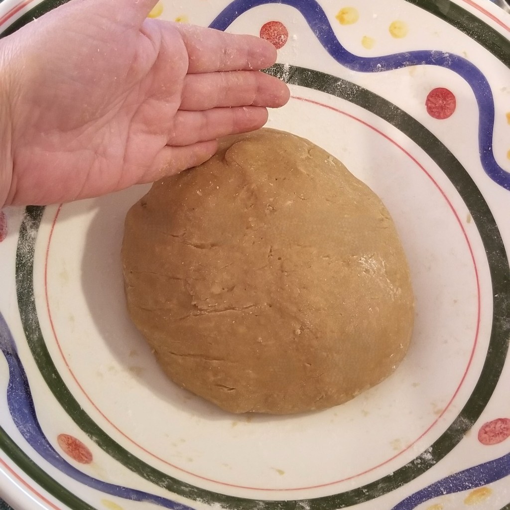 Continue mixing, kneading gently to form a dough (photo below, left). If the dough is too sticky, sprinkle a little flour and knead just a little bit longer (photo below, right):