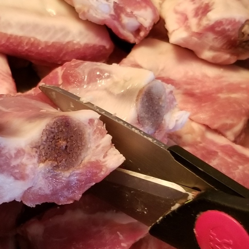 I found side rib racks cut in half lengthwise; the label specified “sweet and sour style”, as the ones used for the Chinese dish: