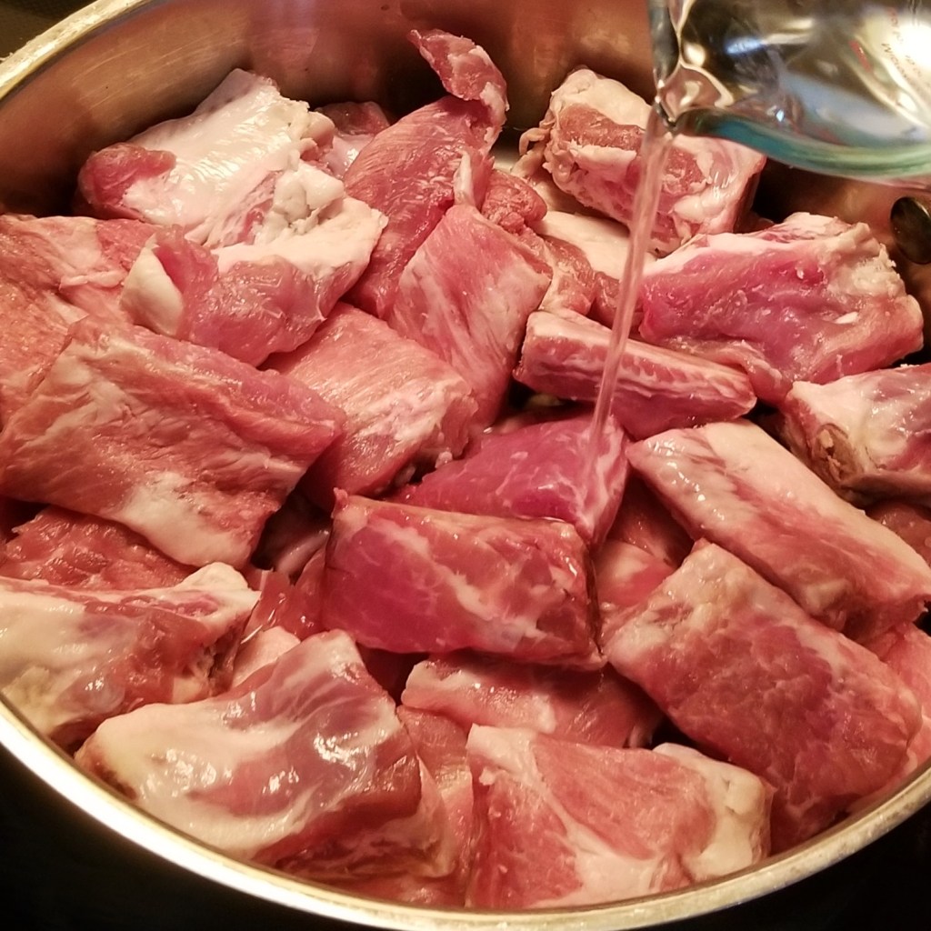Cut meat in between bones (photo below, left), and place in a large wide pan over high heat, then add the water (photo below, right):