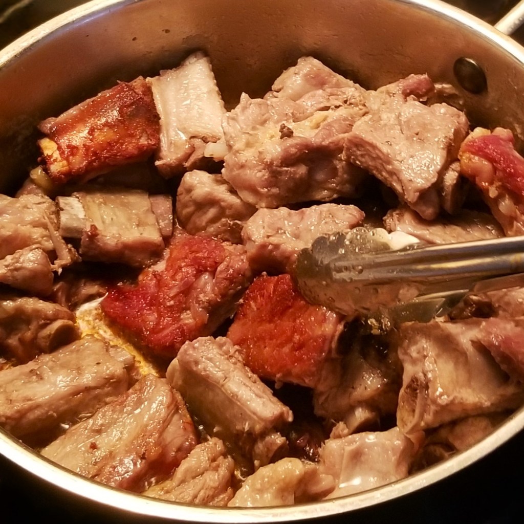 Bring to boil, then lower heat to medium, and cover pan (photo below, left). Allow to cook for one hour.  Uncover pan, and continue cooking for another fifteen to twenty minutes.  Once most of the liquid has evaporated, the meat will start to sizzle, frying in its own rendered fat; turn the ribs as they brown, to crisp on both sides (photo below, right):