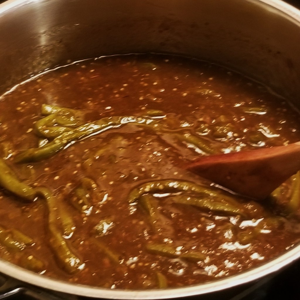 Cook paddle cacti in a large pot following the printable recipe above, or if using pickled strips, pour into a colander to drain liquid, then rinse under cold water to remove stringy liquid, and place in a large pot over medium heat; add reserved sauce (photo below, left).  Stir and cook for another ten minutes, to allow all the flavours to meld together (photo below, right):