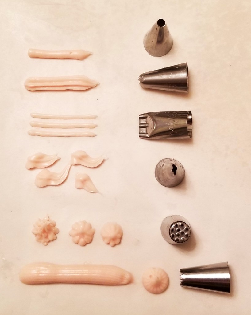 I got a cake decorating kit as a present last Christmas, and I thought today would be a great occasion to get some practice.  I made a batch of chocolate cake and one of my quick butter cream, leaving some in its natural colour, and some was tinted pink.  The cake decorating kit comes with a rotating base, spatulas, scrappers, flower pin and scissors, piping bags and a large collection of tips. I practiced with just a few of the tips for these cakes: