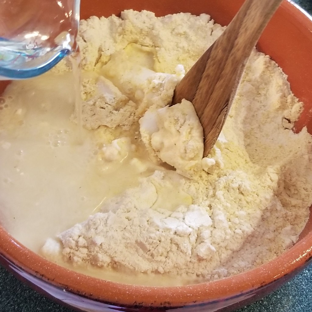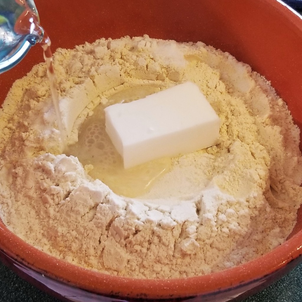 Prepare dough: Place nixtamalized corn flour in a bowl, sprinkling salt on top; open a well in the middle, to add lard (or oil), and half a cup of water (photo below, left). Break up lard, mixing with the other ingredients, gradually adding more water (photo below, right):
