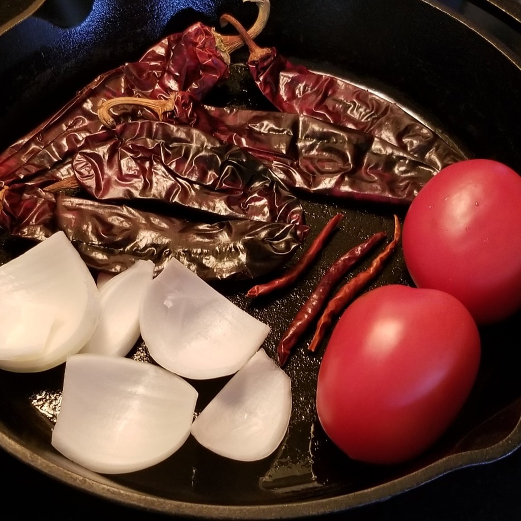 Prepare salsas: Prepare green salsa following the link to my Charred Green Sauce. Reserve. For the red guajillo salsa, place tomatoes, onion, chiles de árbol (if using) and all five guajillo peppers on a lightly greased comal (Mexican flat griddle) or skillet (photo below, left). Turn peppers every few seconds, and remove as soon as they are roasted, to avoid burning (photo below, right):