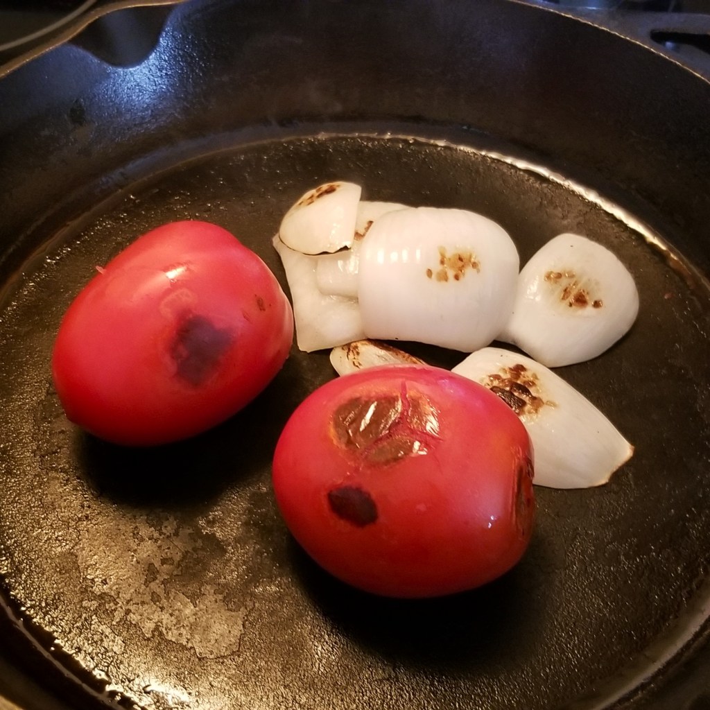 Place the other three guajillo peppers and the chiles de árbol in the freshly boiled water (photo below, left); remove pot from heat, and allow peppers to soak for a few minutes. Meanwhile, continue roasting tomatoes and onions, turning to char all around (photo below, right):