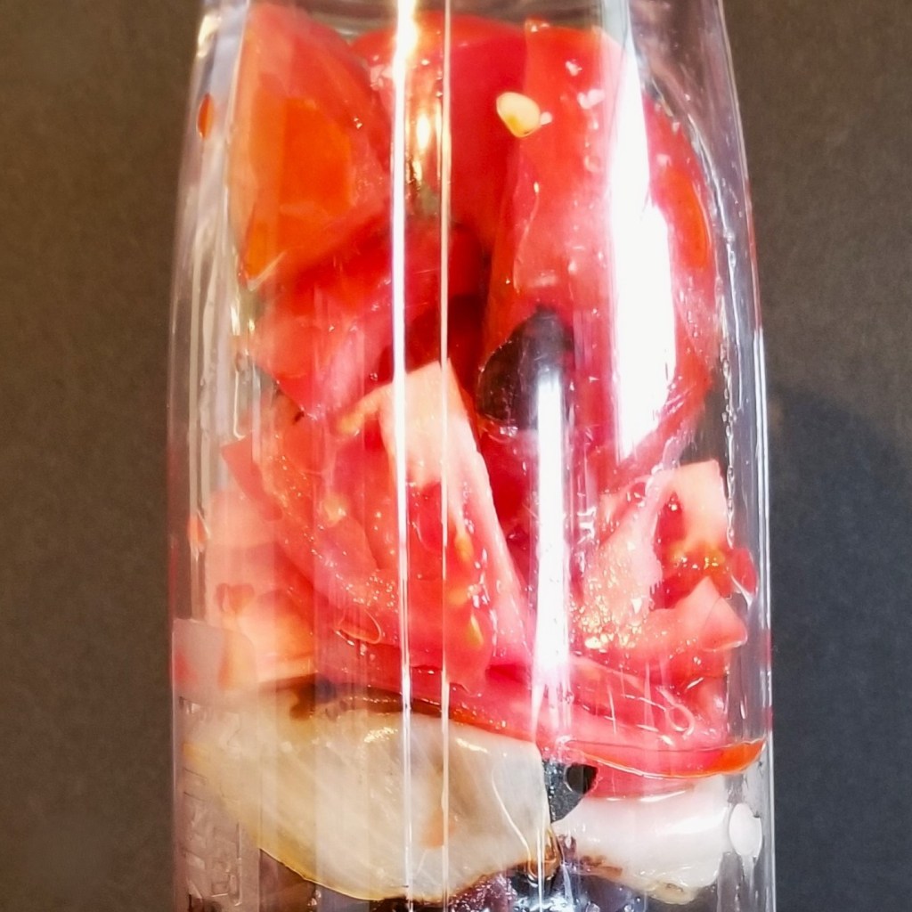 Remove stems from peppers and chiles, and transfer to a blender jar, along with their soaking water; remove stem spots from tomatoes, and cut up into quarters, then add to the blender jar; add roasted onions, garlic clove, and salt (photo below, left); process until smooth (photo below, right):