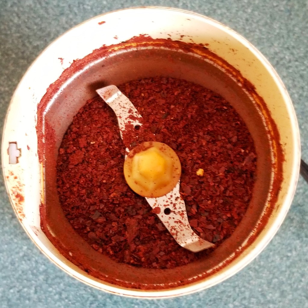 Cheese feeling: remove and discard stems from the two reserved roasted guajillo peppers, cut peppers into pieces and place in a spice grinder (I dedicate my old coffee grinder to spices, photo below, left). Pulse until ground to a powder (photo below, right):