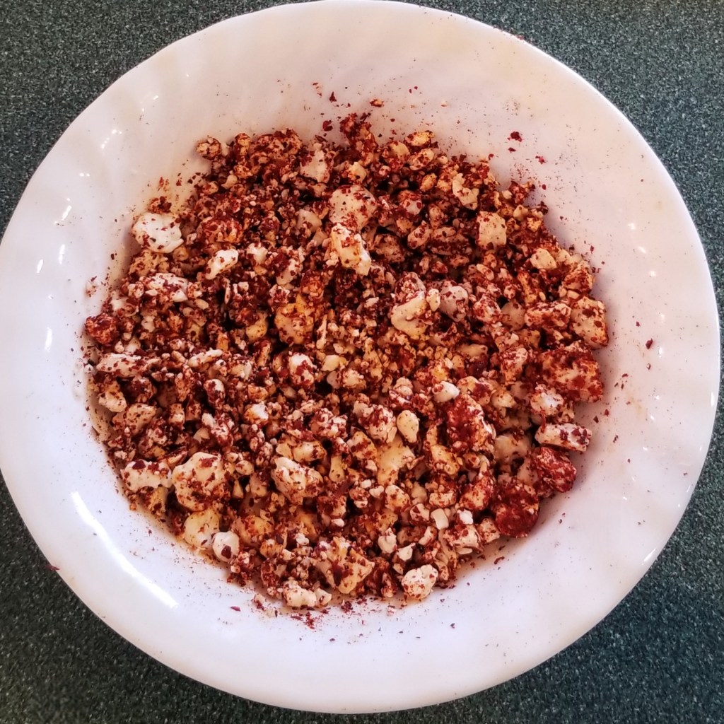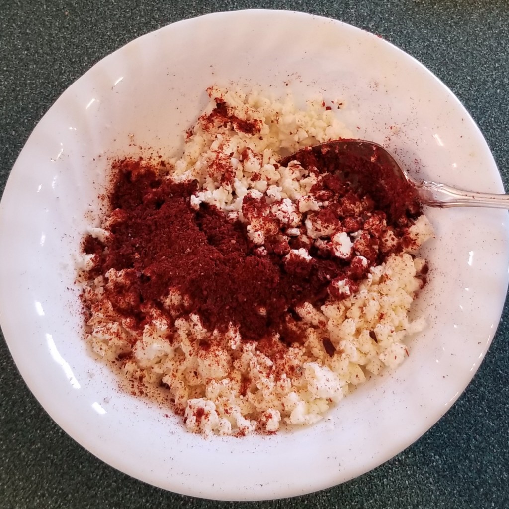 Place crumbled cheese in a bowl, and add guajillo powder (photo below, left), mixing together (photo below, right):