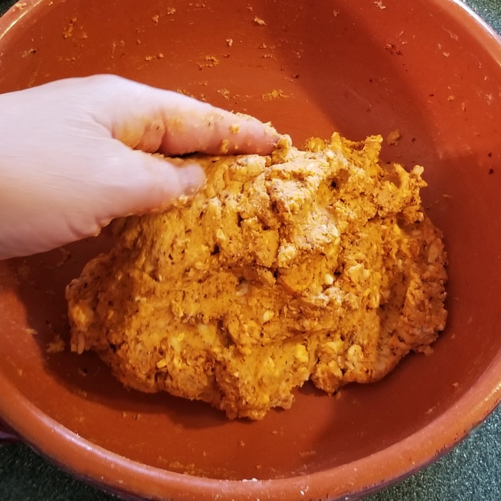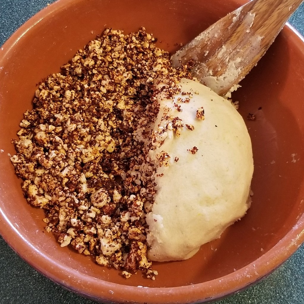 Place the cheese mixture in a bowl with one half of the dough, and incorporate with a spatula (photo below, left); knead lightly by hand until uniform (photo below, right):